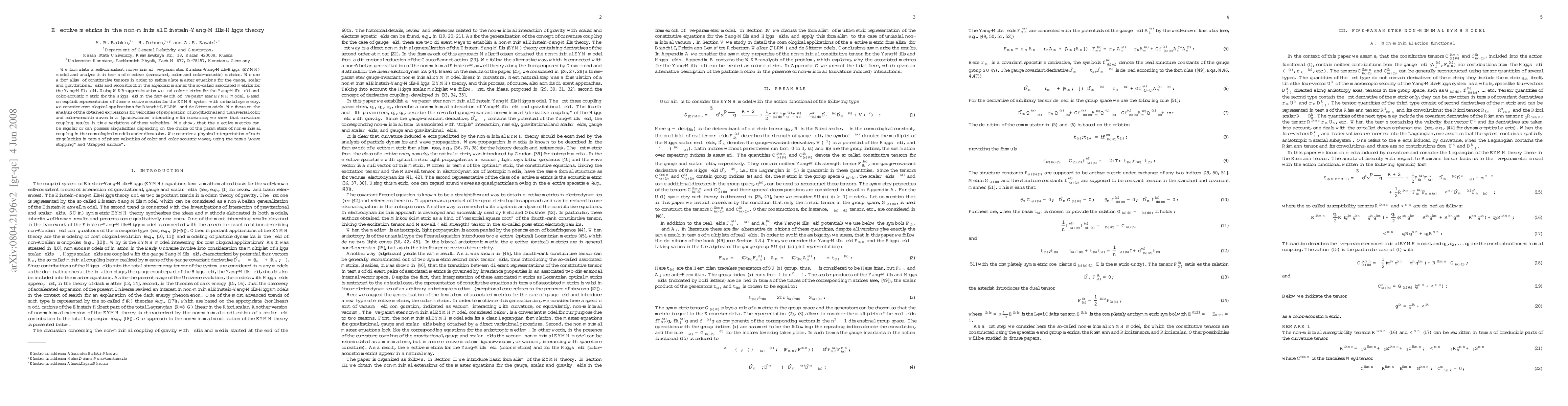 This paper formulates a five-parameter non-minimal Einstein-Yang-Mills-Higgs (EYMH) model and analyzes it through effective metrics. It uses a WKB-approximation to find color and color-acoustic metrics, and explores their implications for cosmological models, highlighting time variations in wave propagation velocities due to curvature coupling and discussing potential singularities in effective metrics.