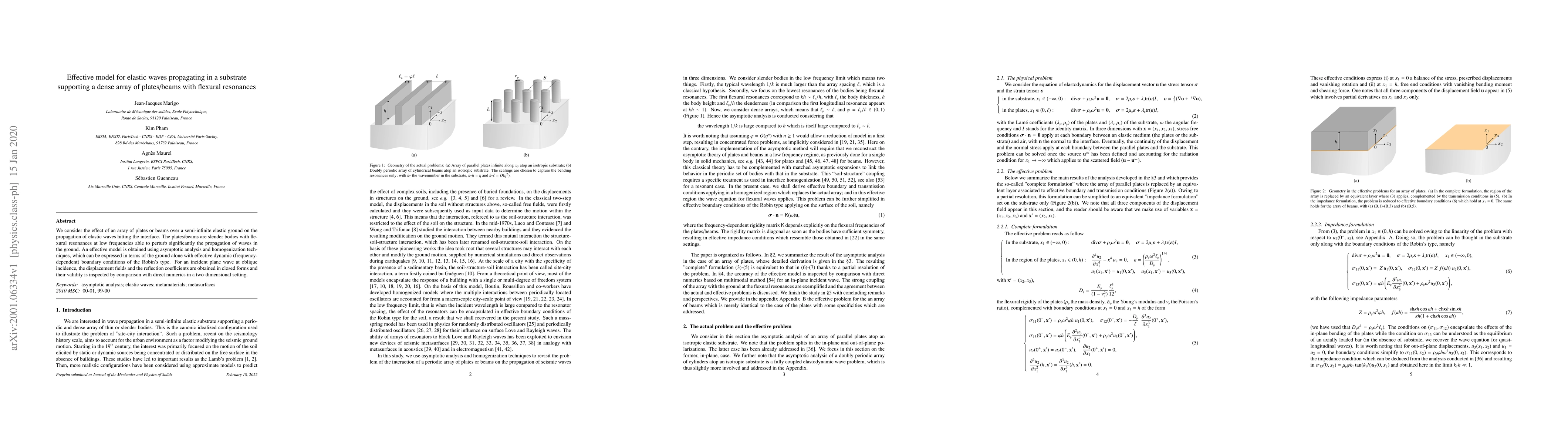 We consider the effect of an array of plates or beams over a semi-infinite elastic ground on the propagation of elastic waves hitting the interface. The plates/beams are slender bodies with flexural resonances at low frequencies able to perturb significantly the propagation of waves in the ground. An effective model is obtained using asymptotic analysis and homogenization techniques, which can be expressed in terms of the ground alone with effective dynamic (frequency-dependent) boundary conditions of the Robin's type. For an incident plane wave at oblique incidence, the displacement fields and the reflection coefficients are obtained in closed forms and their validity is inspected by comparison with direct numerics in a two-dimensional setting.
