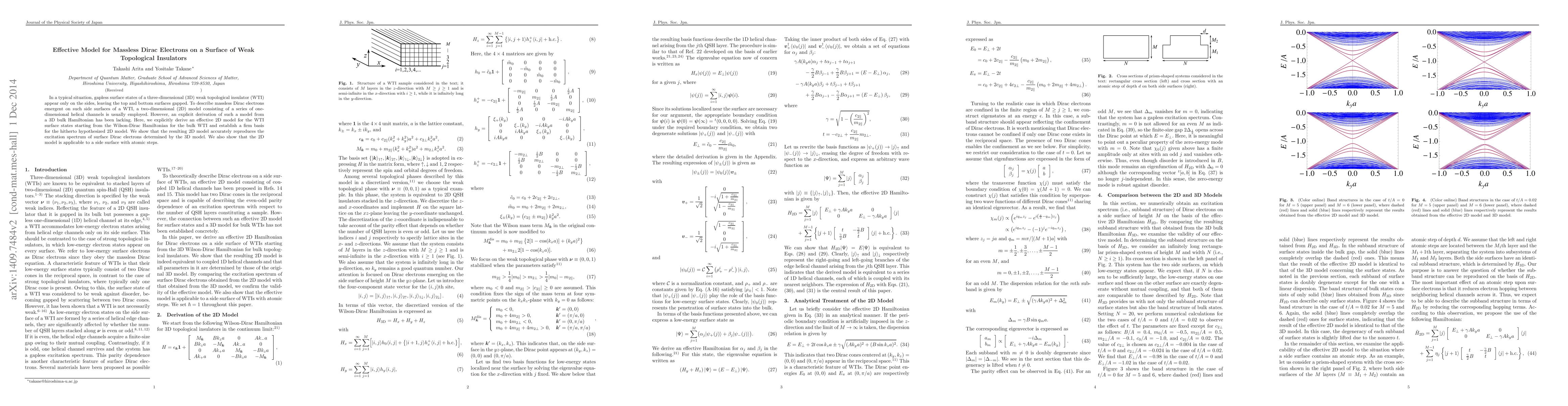 This paper derives an effective two-dimensional (2D) model for massless Dirac electrons on the side surfaces of weak topological insulators (WTIs), starting from a 3D bulk Hamiltonian. The study establishes a solid theoretical foundation for the previously hypothesized 2D model and demonstrates its accuracy in reproducing the surface excitation spectrum.