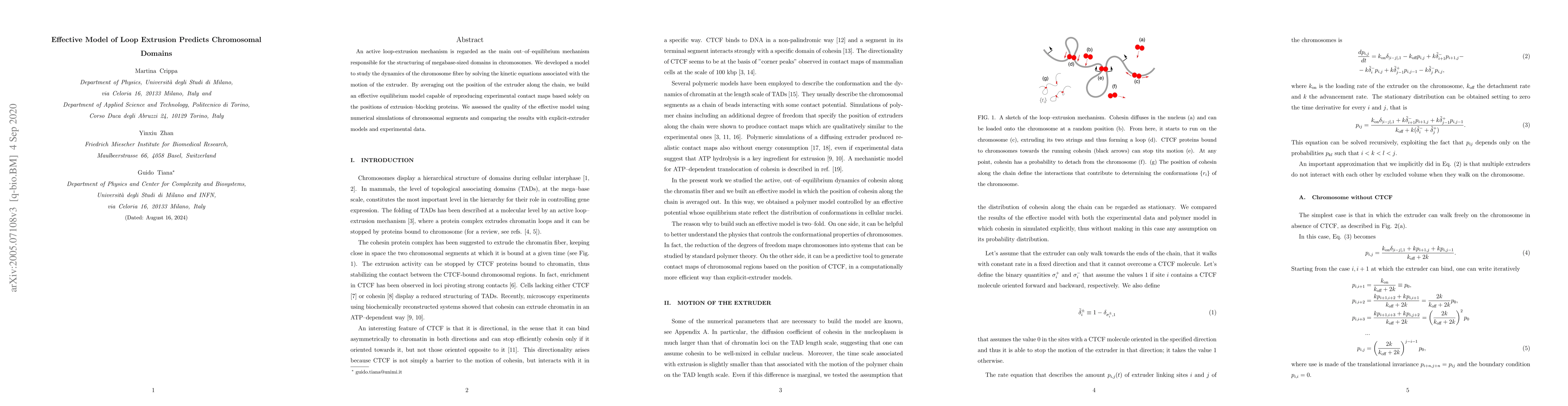 This paper develops an effective model of loop extrusion to predict chromosomal domains, showing that it can reproduce experimental contact maps based on extrusion-blocking proteins. The model's accuracy is validated through numerical simulations and comparison with explicit-extruder models and experimental data.