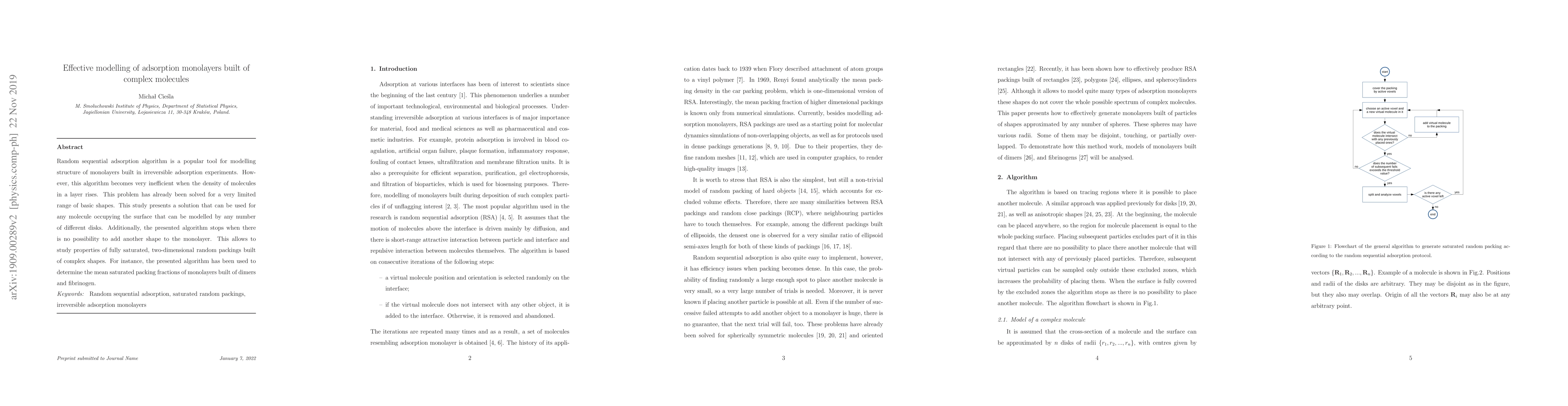 This research introduces an efficient algorithm for modeling complex molecule monolayers in adsorption experiments, overcoming limitations of existing methods. It successfully applies to various shapes and accurately determines properties of fully saturated, two-dimensional packings, as demonstrated by dimers and fibrinogen studies.