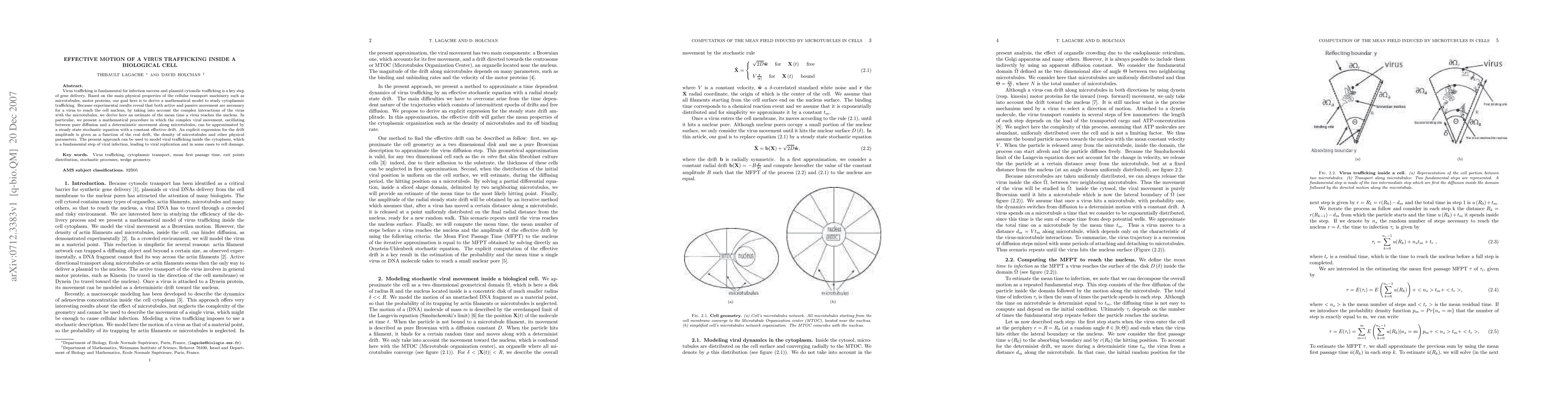 Virus trafficking is fundamental for infection success and plasmid cytosolic trafficking is a key step of gene delivery. Based on the main physical properties of the cellular transport machinery such as microtubules, motor proteins, our goal here is to derive a mathematical model to study cytoplasmic trafficking. Because experimental results reveal that both active and passive movement are necessary for a virus to reach the cell nucleus, by taking into account the complex interactions of the virus with the microtubules, we derive here an estimate of the mean time a virus reaches the nucleus. In particular, we present a mathematical procedure in which the complex viral movement, oscillating between pure diffusion and a deterministic movement along microtubules, can be approximated by a steady state stochastic equation with a constant effective drift. An explicit expression for the drift amplitude is given as a function of the real drift, the density of microtubules and other physical parameters. The present approach can be used to model viral trafficking inside the cytoplasm, which is a fundamental step of viral infection, leading to viral replication and in some cases to cell damage.