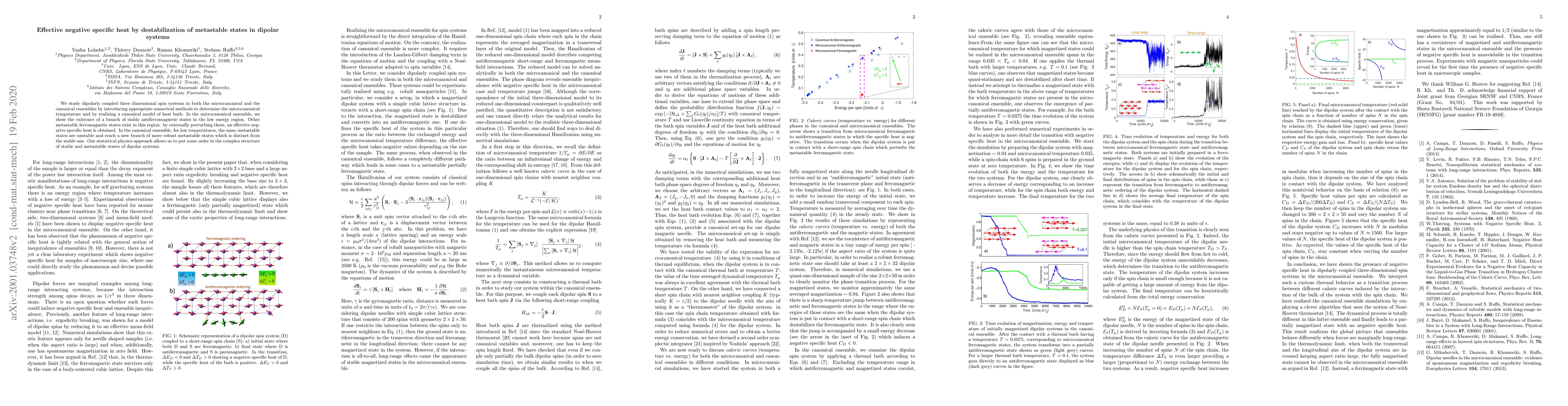 This paper investigates dipolarly coupled three-dimensional spin systems, demonstrating the existence of stable antiferromagnetic states and metastable ferromagnetic states in the microcanonical ensemble. It shows that perturbing these metastable states can yield an effective negative specific heat. In the canonical ensemble, low temperatures destabilize these states, leading to a new branch of more robust metastable states.