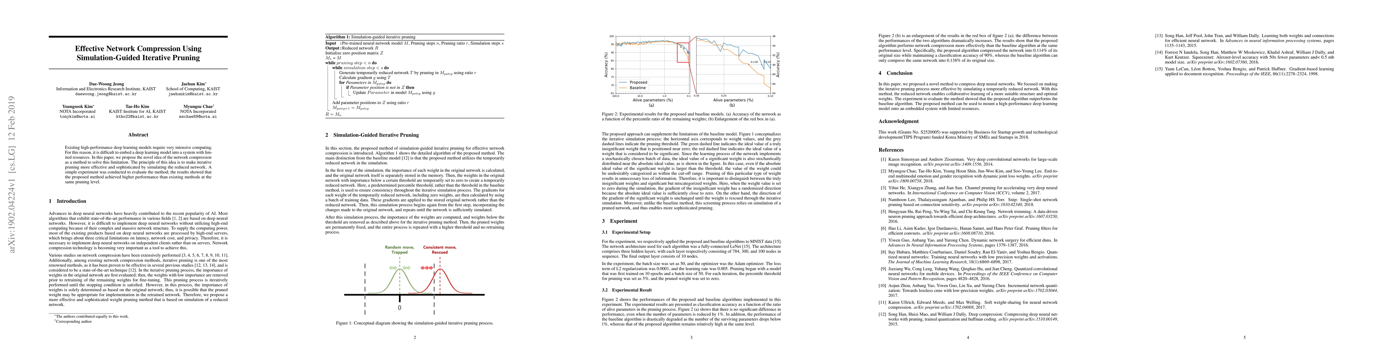 Existing high-performance deep learning models require very intensive computing. For this reason, it is difficult to embed a deep learning model into a system with limited resources. In this paper, we propose the novel idea of the network compression as a method to solve this limitation. The principle of this idea is to make iterative pruning more effective and sophisticated by simulating the reduced network. A simple experiment was conducted to evaluate the method; the results showed that the proposed method achieved higher performance than existing methods at the same pruning level.