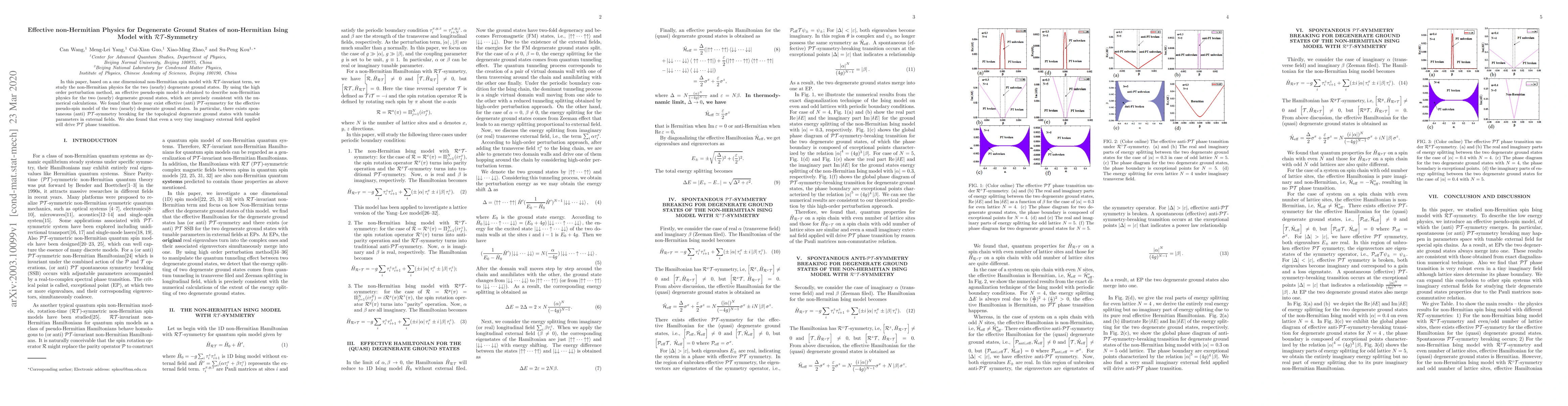 In this paper, based on a one-dimensional non-Hermitian spin model with $\mathcal{RT}$-invariant term, we study the non-Hermitian physics for the two (nearly) degenerate ground states. By using the high-order perturbation method, an effective pseudo-spin model is obtained to describe non-Hermitian physics for the two (nearly) degenerate ground states, which are precisely consistent with the numerical calculations. We found that there may exist effective (anti) $\mathcal{PT}$ symmetry for the effective pseudo-spin model of the two (nearly) degenerate ground states. In particular, there exists spontaneous (anti) $\mathcal{PT}$ -symmetry breaking for the topological degenerate ground states with tunable parameters in external fields. We also found that even a very tiny imaginary external field applied will drive $\mathcal{PT}$ phase transition.