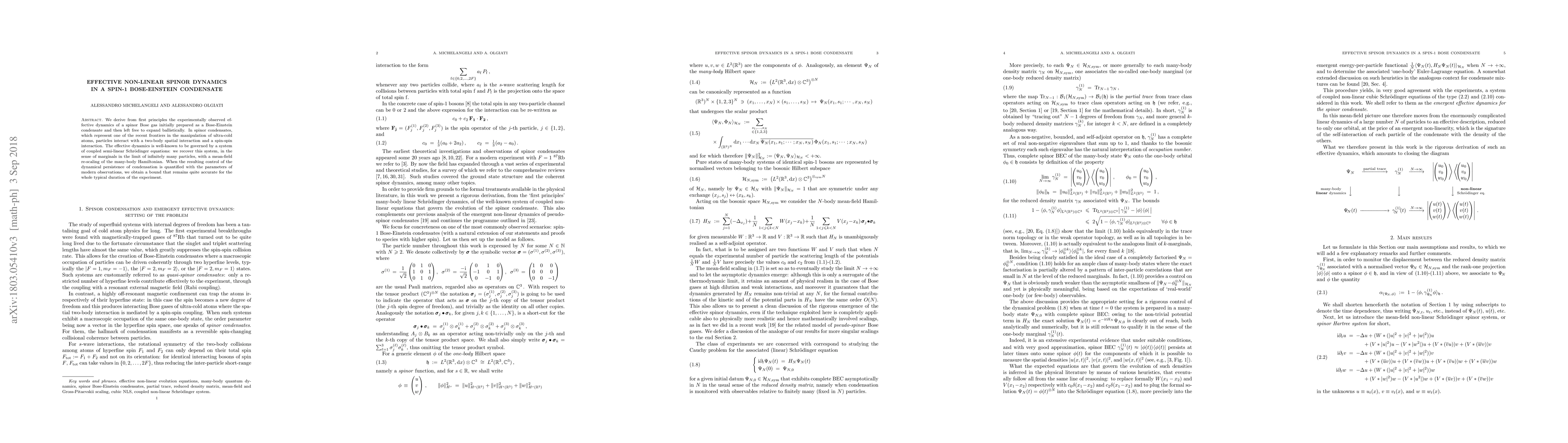 This paper derives the effective non-linear dynamics of a spinor Bose-Einstein condensate from first principles, showing that it is governed by coupled semi-linear Schrödinger equations. The study provides a mean-field re-scaling of the many-body Hamiltonian to accurately predict the dynamical persistence of condensation over typical experimental durations.