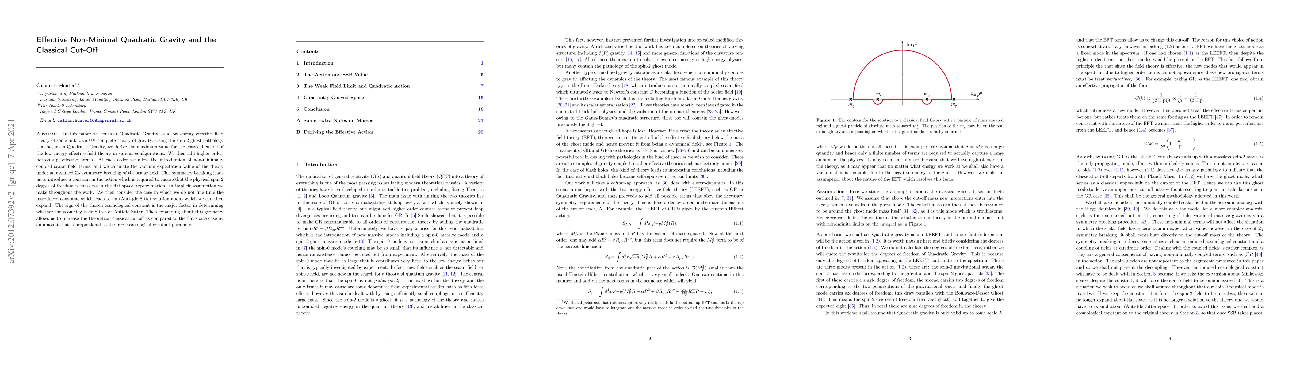 This paper explores Quadratic Gravity as an effective low-energy theory, deriving a classical cut-off based on spin-2 ghost pathology. By incorporating higher-order terms and non-minimally coupled scalar fields, the authors find that an assumed $mathbb{Z}_2$ symmetry breaking of the scalar field allows for a massless physical spin-2 degree of freedom in flat space. Expanding around (Anti-)de Sitter solutions, they increase the theoretical classical cut-off, showing its proportionality to the cosmological constant parameter's sign.