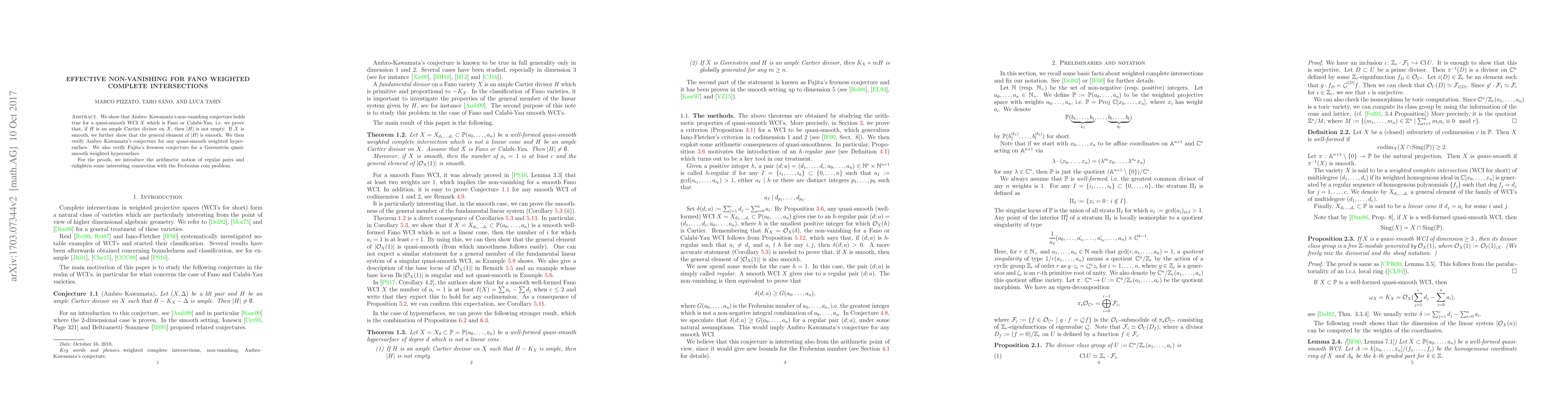 This paper proves Ambro-Kawamata's non-vanishing conjecture for quasi-smooth Fano or Calabi-Yau weighted complete intersections, showing that ample divisors have non-empty linear systems. It also verifies Fujita's freeness conjecture for Gorenstein quasi-smooth weighted hypersurfaces and introduces the concept of regular pairs in arithmetic geometry.