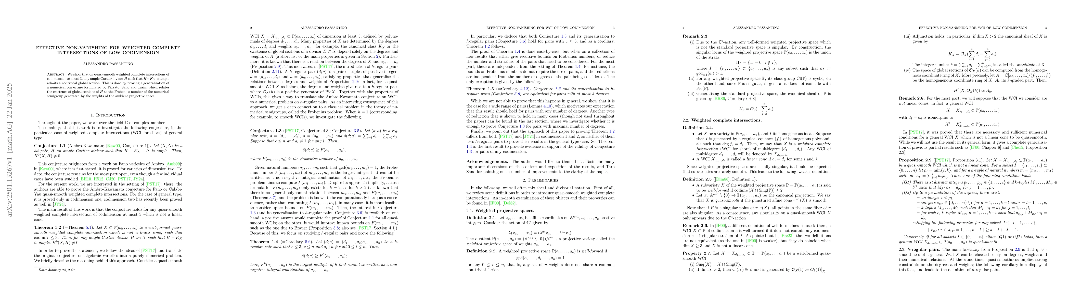 The paper demonstrates that quasi-smooth weighted complete intersections of codimension at most 3 with an ample Cartier divisor $H$ satisfying $H-K_X$ being ample have nontrivial global sections. This result verifies a generalized conjecture linking the existence of these sections to the Frobenius number of the weights' numerical semigroup.