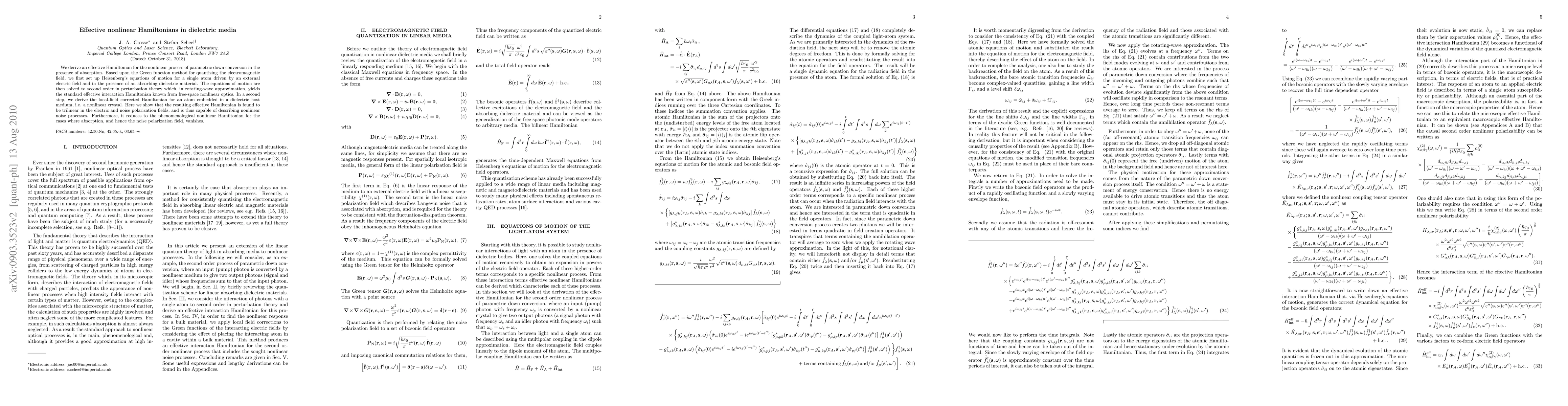 Researchers developed an effective nonlinear Hamiltonian for parametric down conversion in dielectric media, describing trilinear interactions between electric and noise polarization fields.