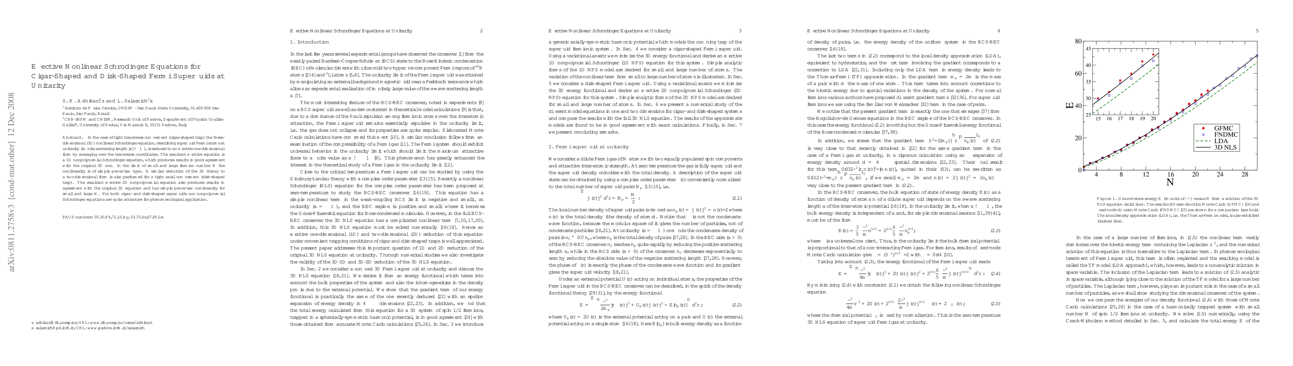 In the case of tight transverse confinement (cigar-shaped trap) the three-dimensional (3D) nonlinear Schr\"odinger equation, describing superfluid Fermi atoms at unitarity (infinite scattering length $|a|\to \infty$), is reduced to an effective one-dimensional form by averaging over the transverse coordinates. The resultant effective equation is a 1D nonpolynomial Schrodinger equation, which produces results in good agreement with the original 3D one. In the limit of small and large fermion number $N$ the nonlinearity is of simple power-law type. A similar reduction of the 3D theory to a two-dimensional form is also performed for a tight axial confinement (disk-shaped trap). The resultant effective 2D nonpolynomial equation also produces results in agreement with the original 3D equation and has simple power-law nonlinearity for small and large $N$. For both cigar- and disk-shaped superfluids our nonpolynomial Schr\"odinger equations are quite attractive for phenomenological application.