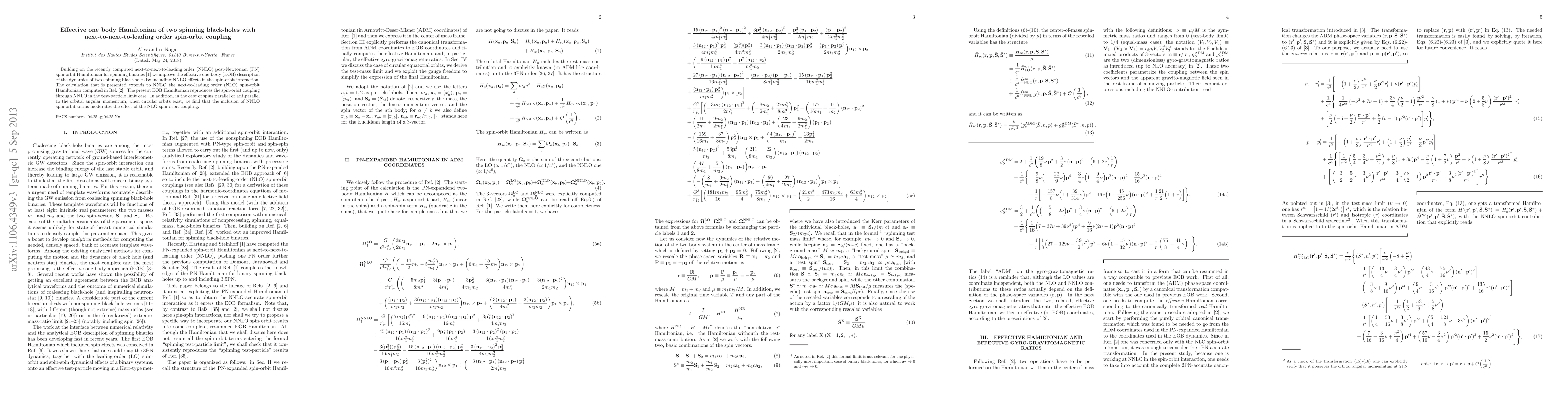 This paper extends the effective-one-body (EOB) Hamiltonian for two spinning black holes to next-to-next-to-leading order (NNLO) in spin-orbit coupling, improving upon previous next-to-leading order (NLO) calculations. The new NNLO EOB Hamiltonian accurately reproduces spin-orbit interactions up to NNLO and moderates the effects of NLO spin-orbit coupling when spins align with the orbital angular momentum.