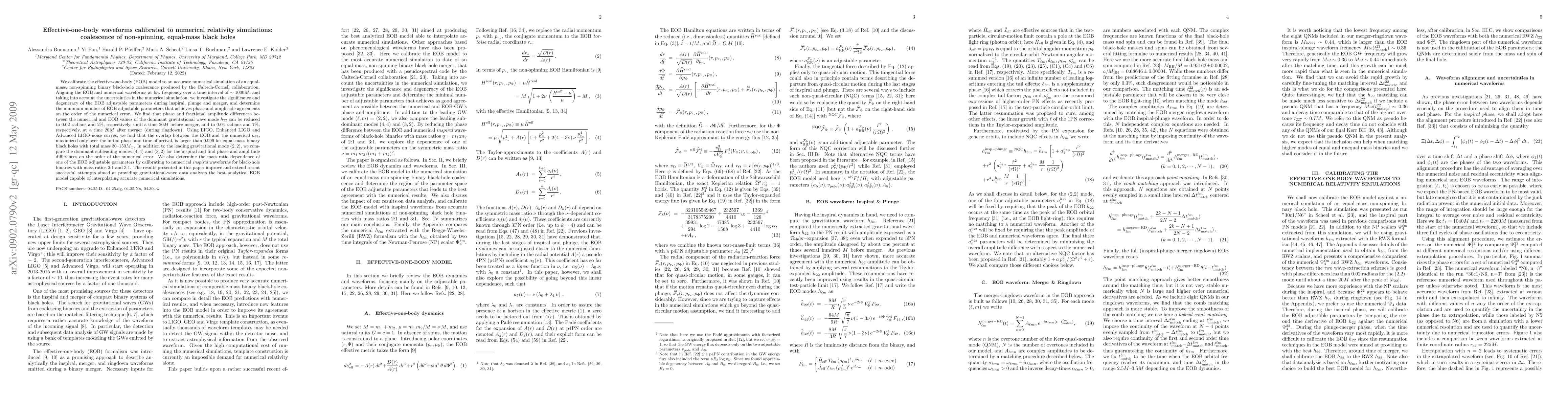 This paper calibrates the effective-one-body (EOB) model to match numerical relativity simulations of equal-mass, non-spinning black hole mergers, achieving phase and amplitude agreements within numerical error margins. The EOB model's accuracy is demonstrated across inspiral, plunge, and merger phases, and its applicability is validated against LIGO noise curves.