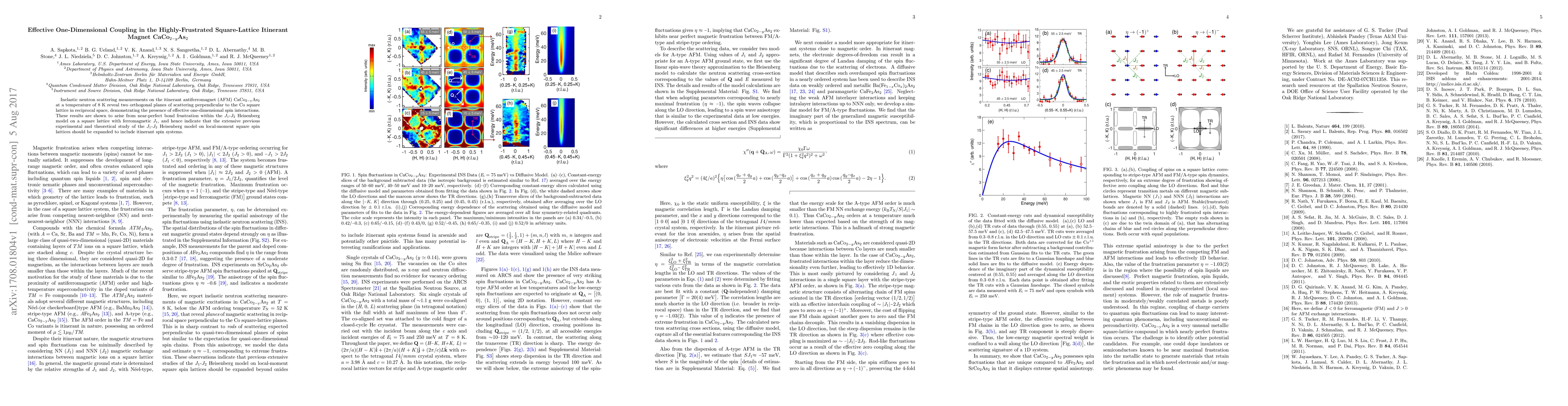 Inelastic neutron scattering measurements on the itinerant antiferromagnet (AFM) CaCo$_{\mathrm{2}-y}$As$_{2}$ at a temperature of 8 K reveal two orthogonal planes of scattering perpendicular to the Co square lattice in reciprocal space, demonstrating the presence of effective one-dimensional spin interactions. These results are shown to arise from near-perfect bond frustration within the $J_1$-$J_2$ Heisenberg model on a square lattice with ferromagnetic $J_1$, and hence indicate that the extensive previous experimental and theoretical study of the $J_1$-$J_2$ Heisenberg model on local-moment square spin lattices should be expanded to include itinerant spin systems.