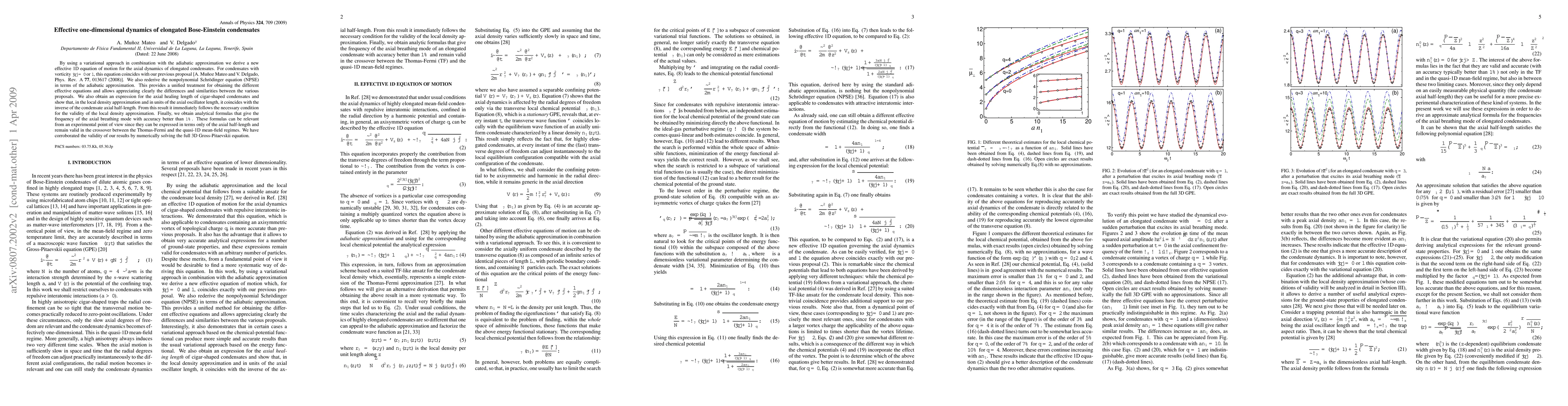 By using a variational approach in combination with the adiabatic approximation we derive a new effective 1D equation of motion for the axial dynamics of elongated condensates. For condensates with vorticity $|q|=0$ or 1, this equation coincides with our previous proposal [A. Mu\~noz Mateo and V. Delgado, Phys. Rev. A \textbf{77}, 013617 (2008)]. We also rederive the nonpolynomial Schr\"{o}dinger equation (NPSE) in terms of the adiabatic approximation. This provides a unified treatment for obtaining the different effective equations and allows appreciating clearly the differences and similarities between the various proposals. We also obtain an expression for the axial healing length of cigar-shaped condensates and show that, in the local density approximation and in units of the axial oscillator length, it coincides with the inverse of the condensate axial half-length. From this result it immediately follows the necessary condition for the validity of the local density approximation. Finally, we obtain analytical formulas that give the frequency of the axial breathing mode with accuracy better than 1%. These formulas can be relevant from an experimental point of view since they can be expressed in terms only of the axial half-length and remain valid in the crossover between the Thomas-Fermi and the quasi-1D mean-field regimes. We have corroborated the validity of our results by numerically solving the full 3D Gross-Pitaevskii equation.