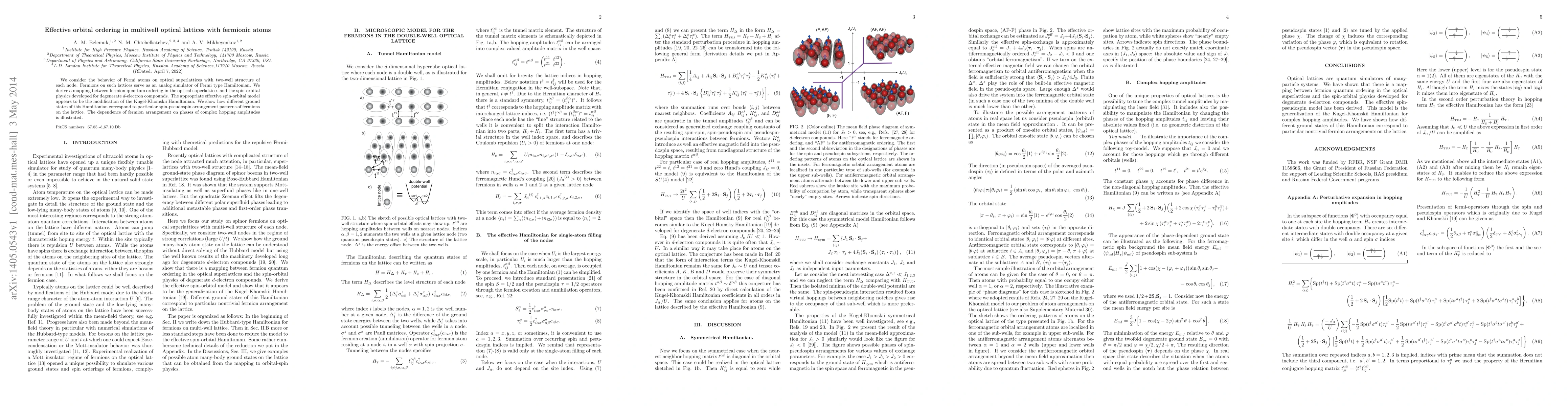 Summary: This paper investigates Fermi atoms in optical superlattices with two-well nodes, mapping their quantum ordering to spin-orbital physics akin to $d$-electron compounds, utilizing a modified Kugel-Khomskii Hamiltonian to describe fermion ground states and their dependence on hopping amplitudes' phases.