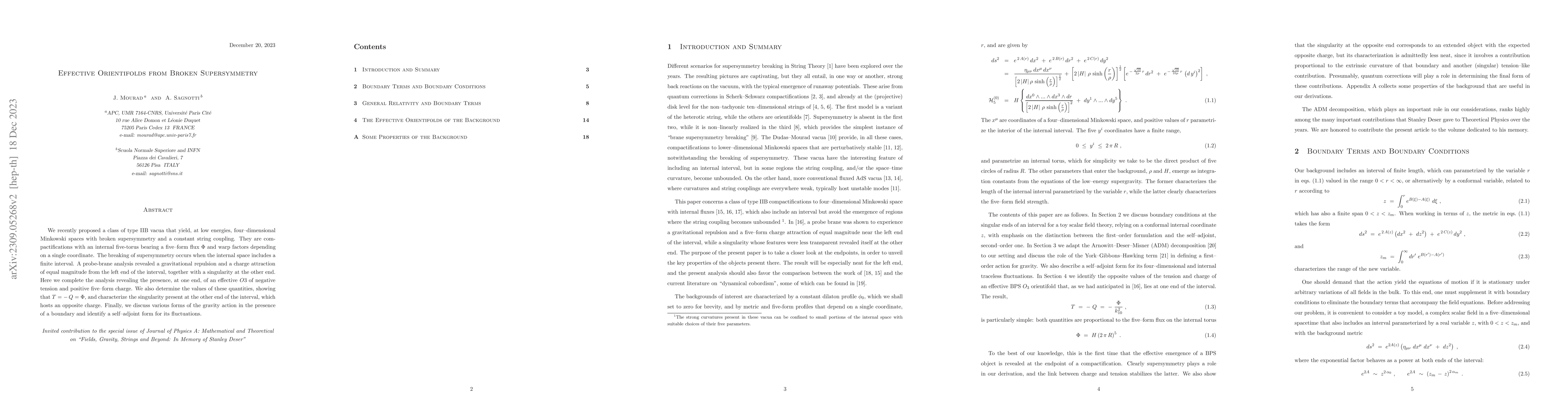 We recently proposed a class of type IIB vacua that yield, at low energies, four--dimensional Minkowski spaces with broken supersymmetry and a constant string coupling. They are compactifications with an internal five-torus bearing a five--form flux $\Phi$ and warp factors depending on a single coordinate. The breaking of supersymmetry occurs when the internal space includes a finite interval. A probe-brane analysis revealed a gravitational repulsion and a charge attraction of equal magnitude from the left end of the interval, and a singularity at the other end. Here we complete the analysis revealing the presence, at one end, of an effective $O3$ of negative tension and positive five--form charge. We also determine the values of these quantities, and show that $T = -\, Q = \Phi$, and characterize the singularity present at the other end of the interval, which hosts an opposite charge. Finally, we discuss various forms of the gravity action in the presence of a boundary and identify a self--adjoint form for its fluctuations.
