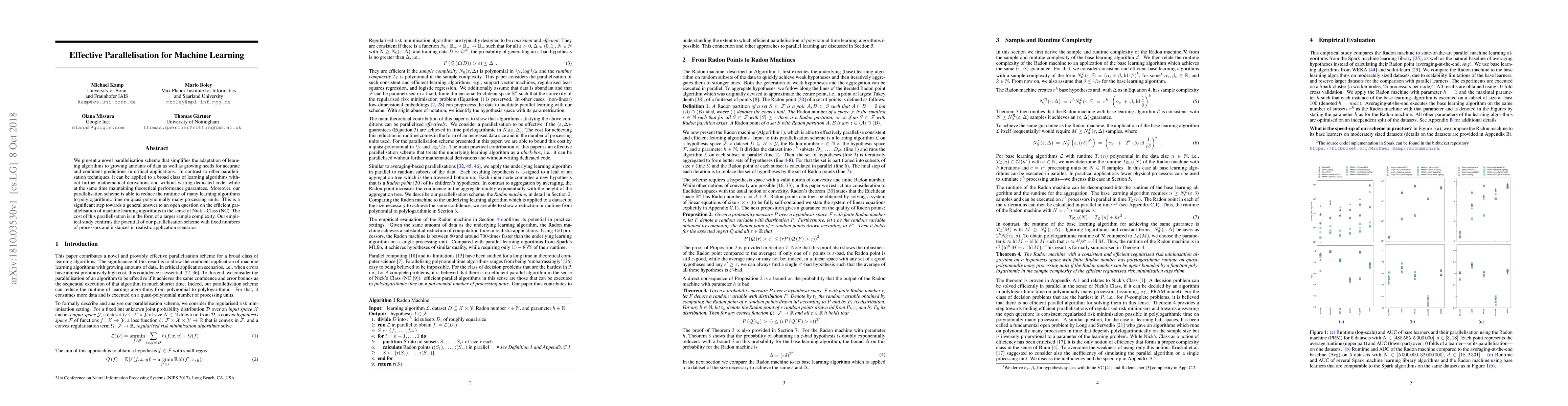 We present a novel parallelisation scheme that simplifies the adaptation of learning algorithms to growing amounts of data as well as growing needs for accurate and confident predictions in critical applications. In contrast to other parallelisation techniques, it can be applied to a broad class of learning algorithms without further mathematical derivations and without writing dedicated code, while at the same time maintaining theoretical performance guarantees. Moreover, our parallelisation scheme is able to reduce the runtime of many learning algorithms to polylogarithmic time on quasi-polynomially many processing units. This is a significant step towards a general answer to an open question on the efficient parallelisation of machine learning algorithms in the sense of Nick's Class (NC). The cost of this parallelisation is in the form of a larger sample complexity. Our empirical study confirms the potential of our parallelisation scheme with fixed numbers of processors and instances in realistic application scenarios.
