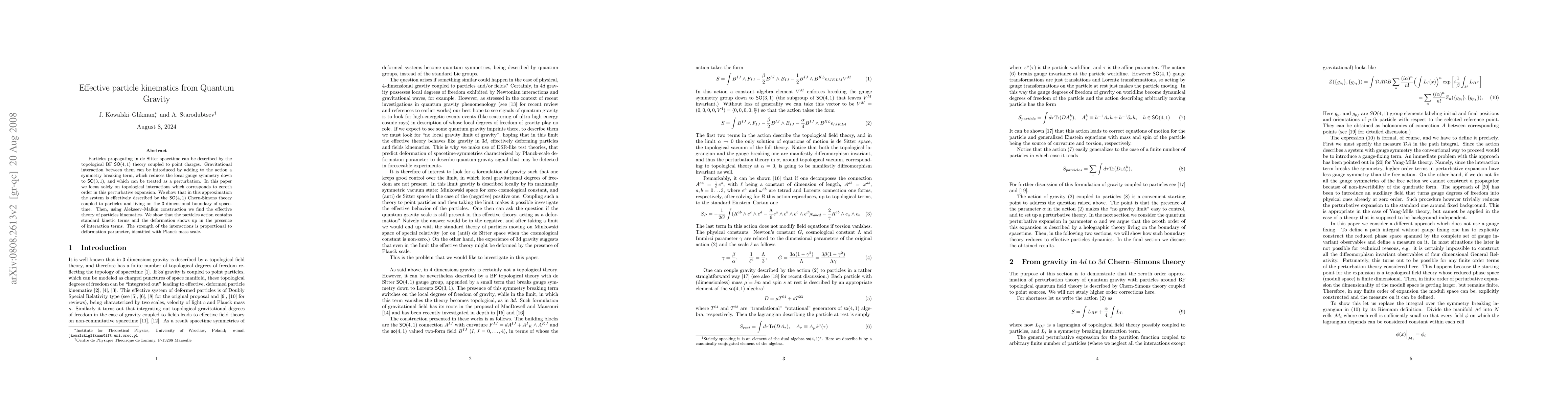 Particles propagating in de Sitter spacetime can be described by the topological BF $\SO(4,1)$ theory coupled to point charges. Gravitational interaction between them can be introduced by adding to the action a symmetry breaking term, which reduces the local gauge symmetry down to $\SO(3,1)$, and which can be treated as a perturbation. In this paper we focus solely on topological interactions which corresponds to zeroth order in this perturbative expansion. We show that in this approximation the system is effectively described by the $\SO(4,1)$ Chern-Simons theory coupled to particles and living on the 3 dimensional boundary of space-time. Then, using Alekseev--Malkin construction we find the effective theory of particles kinematics. We show that the particles action contains standard kinetic terms and the deformation shows up in the presence of interaction terms. The strength of the interactions is proportional to deformation parameter, identified with Planck mass scale.