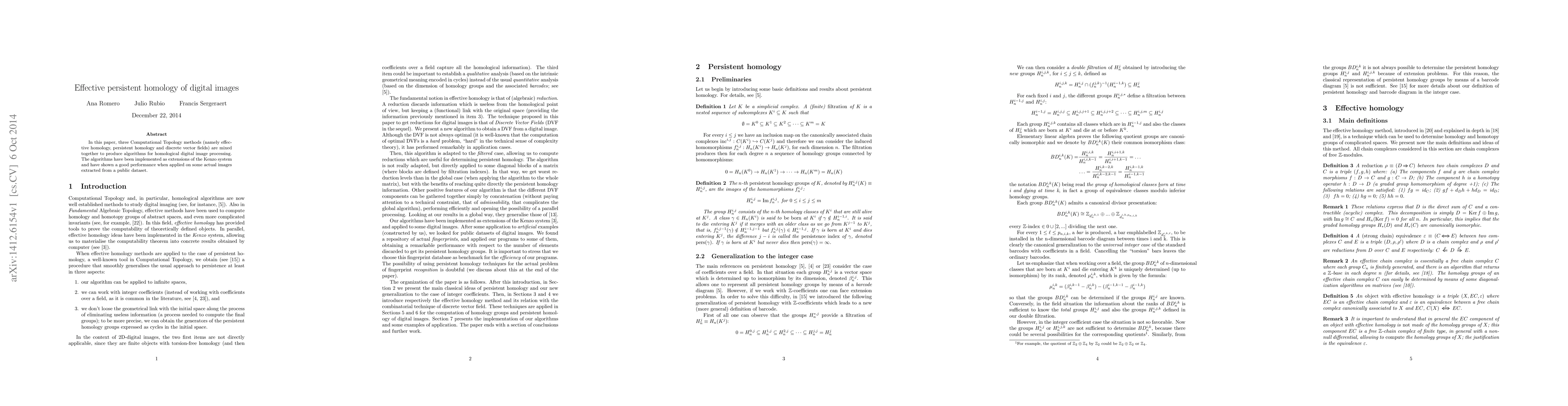 In this paper, three Computational Topology methods (namely effective homology, persistent homology and discrete vector fields) are mixed together to produce algorithms for homological digital image processing. The algorithms have been implemented as extensions of the Kenzo system and have shown a good performance when applied on some actual images extracted from a public dataset.