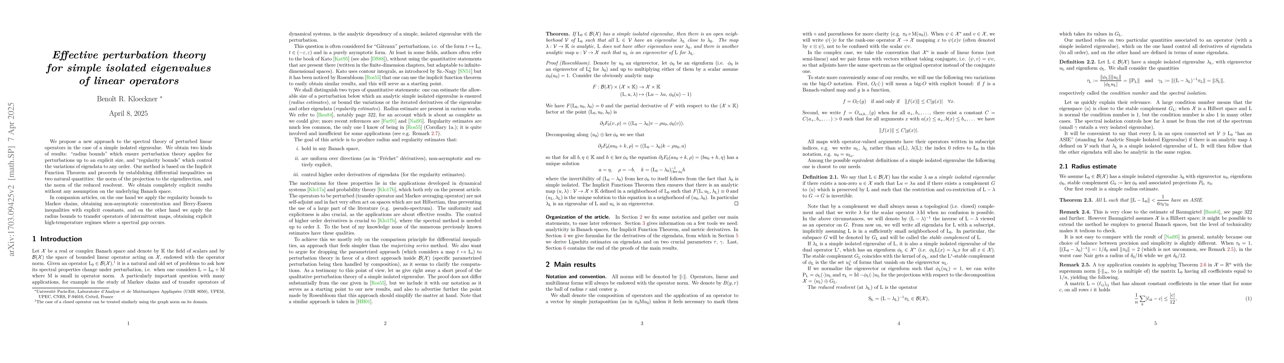 We propose a new approach to the spectral theory of perturbed linear operators , in the case of a simple isolated eigenvalue. We obtain two kind of results: "radius bounds" which ensure perturbation theory applies for perturbations up to an explicit size, and "regularity bounds" which control the variations of eigendata to any order. Our method is based on the Implicit Function Theorem and proceeds by establishing differential inequalities on two natural quantities: the norm of the projection to the eigendirection, and the norm of the reduced resolvent. We obtain completely explicit results without any assumption on the underlying Banach space. In companion articles, on the one hand we apply the regularity bounds to Markov chains, obtaining non-asymptotic concentration and Berry-Ess{\'e}en inequalities with explicit constants, and on the other hand we apply the radius bounds to transfer operator of intermittent maps, obtaining explicit high-temperature regimes where a spectral gap occurs.