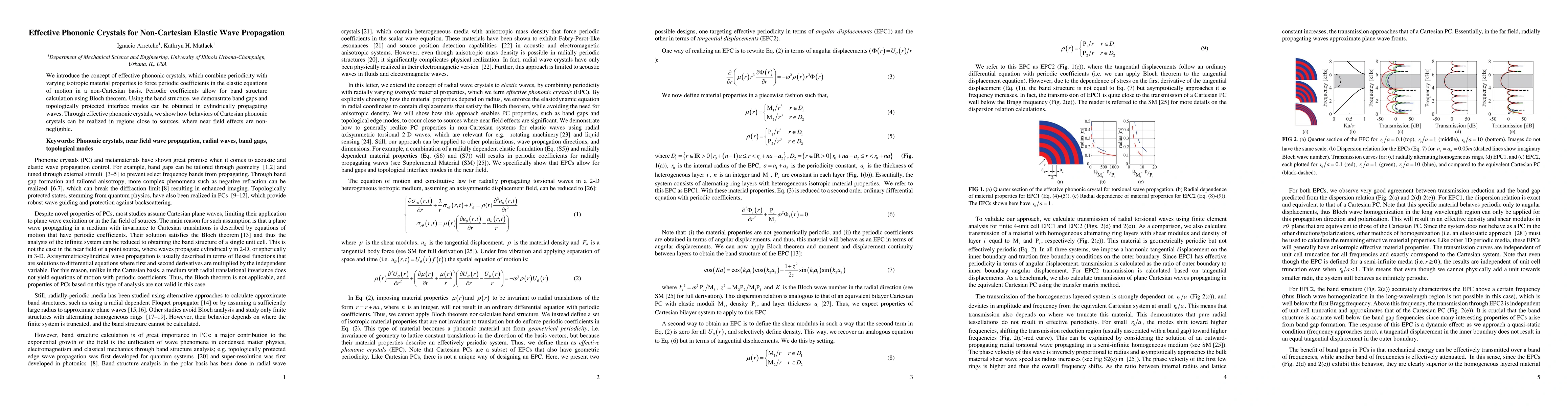 This paper proposes effective phononic crystals that utilize varying material properties to create periodic coefficients in elastic wave equations for non-Cartesian systems, allowing for band structure analysis and revealing band gaps and topologically protected modes in cylindrical wave propagation. It demonstrates how these crystals can replicate Cartesian phononic crystal behaviors in regions with significant near field effects.
