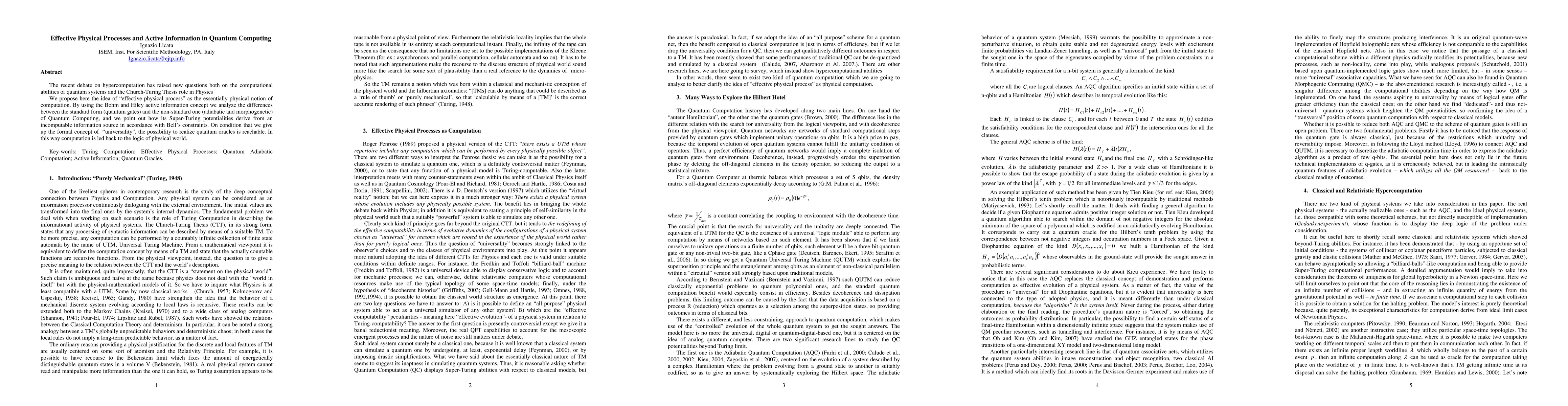 The recent debate on hypercomputation has arisen new questions both on the computational abilities of quantum systems and the Church-Turing Thesis role in Physics. We propose here the idea of "effective physical process" as the essentially physical notion of computation. By using the Bohm and Hiley active information concept we analyze the differences between the standard form (quantum gates) and the non-standard one (adiabatic and morphogenetic) of Quantum Computing, and we point out how its Super-Turing potentialities derive from an incomputable information source in accordance with Bell's constraints. On condition that we give up the formal concept of "universality", the possibility to realize quantum oracles is reachable. In this way computation is led back to the logic of physical world.