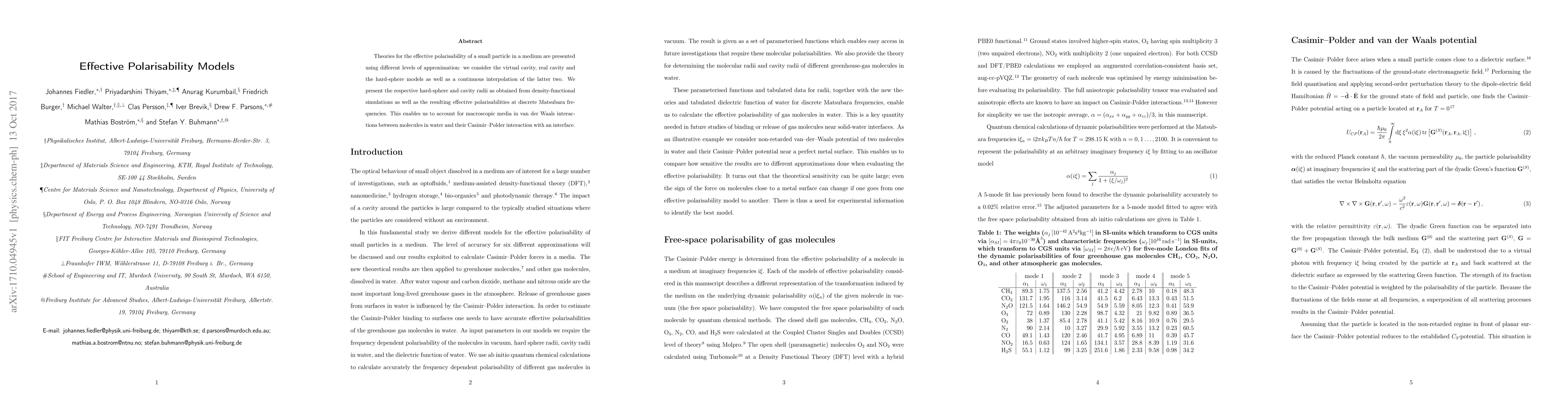 Theories for the effective polarisability of a small particle in a medium are presented using different levels of approximation: we consider the virtual cavity, real cavity and the hard-sphere models as well as a continuous interpolation of the latter two. We present the respective hard-sphere and cavity radii as obtained from density-functional simulations as well as the resulting effective polarisabilities at discrete Matsubara frequencies. This enables us to account for macroscopic media in van der Waals interactions between molecules in water and their Casimir-Polder interaction with an interface.