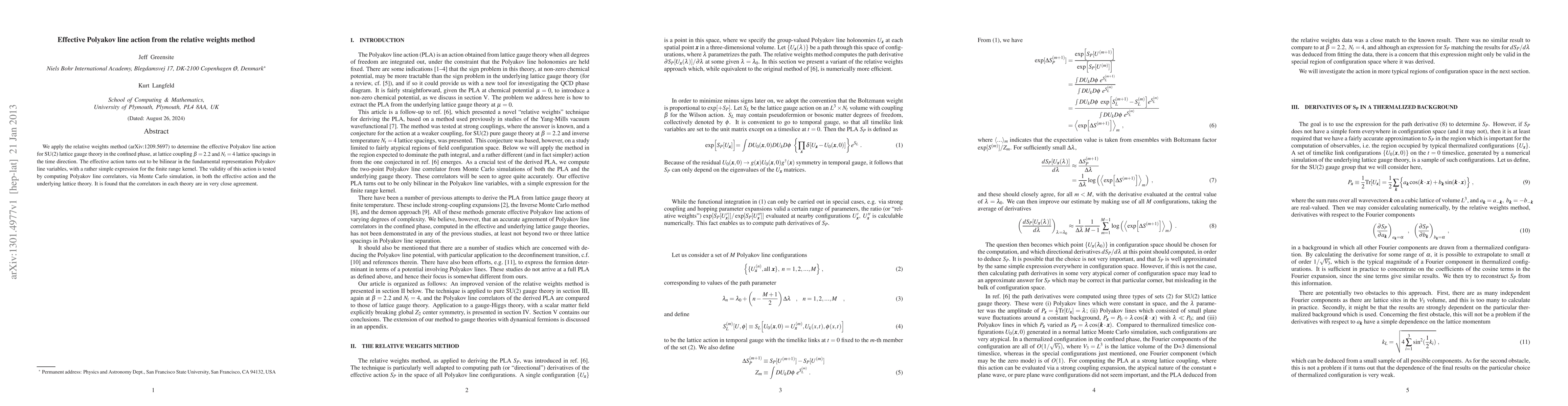 This paper applies the relative weights method to derive an effective Polyakov line action for SU(2) lattice gauge theory in the confined phase, showing it is bilinear in fundamental representation variables. Monte Carlo simulations confirm the action's validity by demonstrating close agreement between correlators computed using the effective action and the original lattice theory.