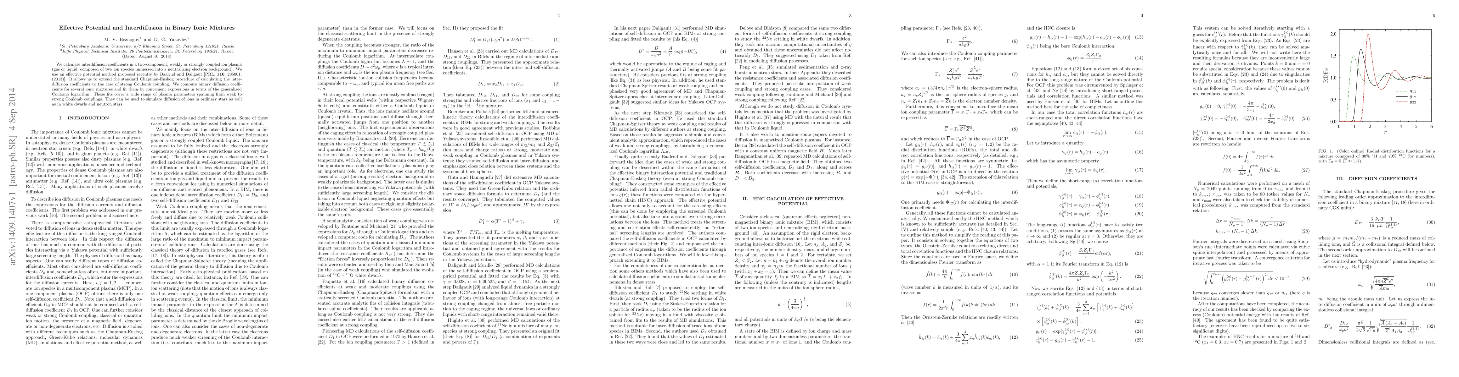 This paper calculates interdiffusion coefficients in binary ionic mixtures using an effective potential method, extending the Chapman-Enskog procedure to strong Coulomb coupling. The results provide fits for simulating ion diffusion across various astrophysical plasma environments.