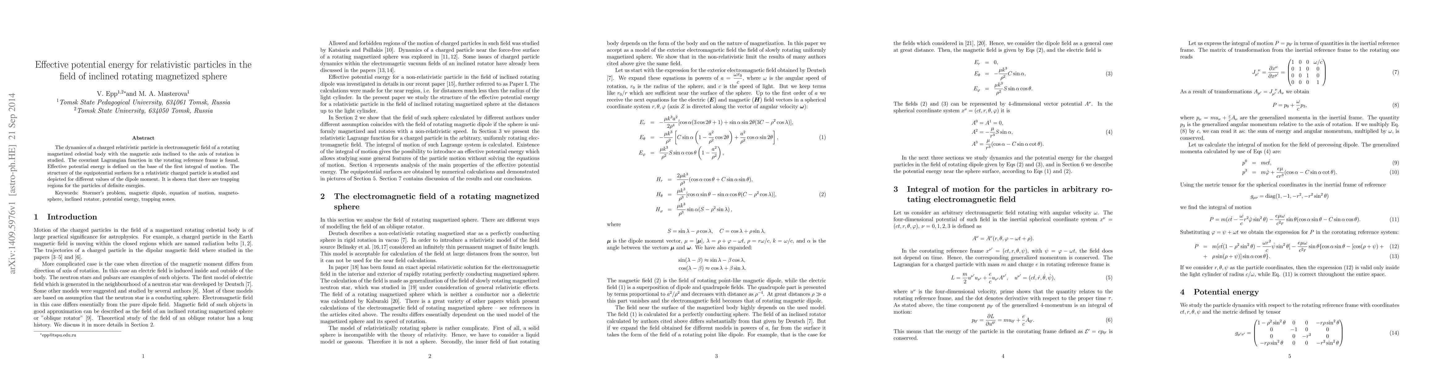The dynamics of a charged relativistic particle in electromagnetic field of a rotating magnetized celestial body with the magnetic axis inclined to the axis of rotation is studied. The covariant Lagrangian function in the rotating reference frame is found. Effective potential energy is defined on the base of the first integral of motion. The structure of the equipotential surfaces for a relativistic charged particle is studied and depicted for different values of the dipole moment. It is shown that there are trapping regions for the particles of definite energies.