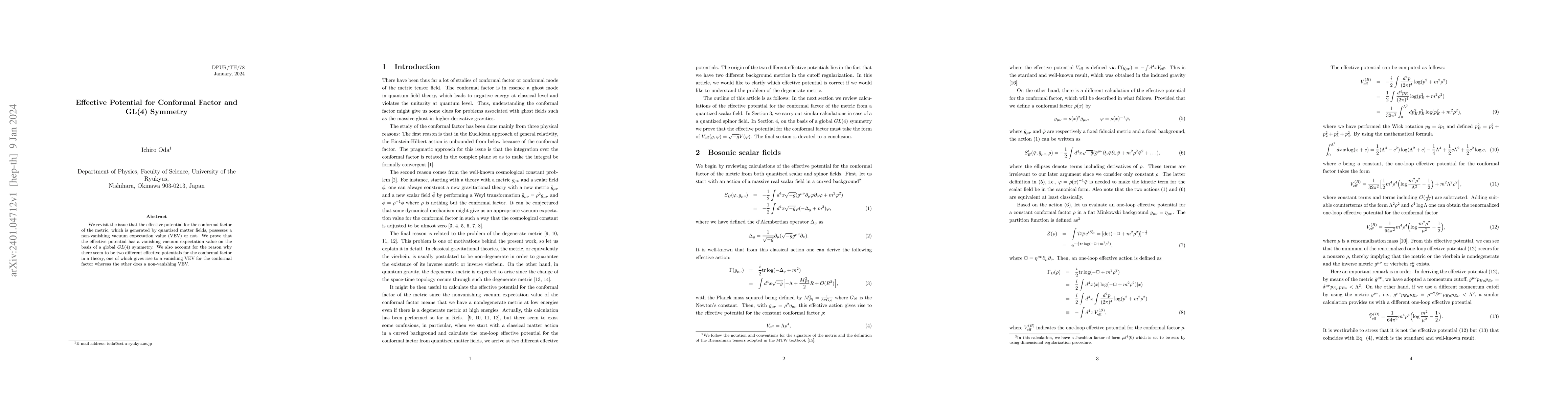 We revisit the issue that the effective potential for the conformal factor of the metric, which is generated by quantized matter fields, possesses a non-vanishing vacuum expectation value (VEV) or not. We prove that the effective potential has a vanishing vacuum expectation value on the basis of a global $GL(4)$ symmetry. We also account for the reason why there seem to be two different effective potentials for the conformal factor in a theory, one of which gives rise to a vanishing VEV for the conformal factor whereas the other does a non-vanishing VEV.