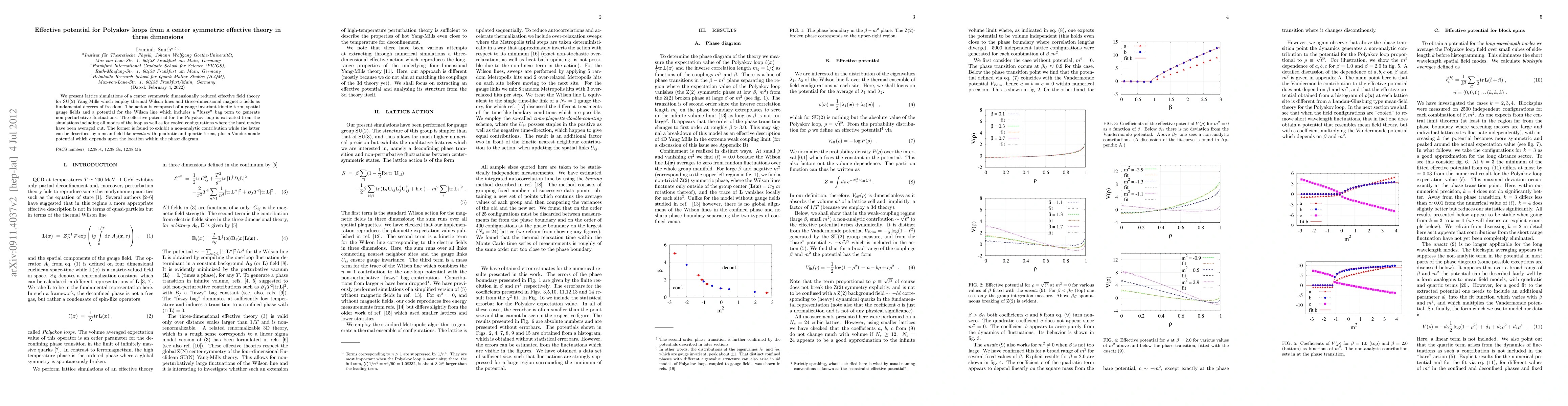 This paper presents lattice simulations of a center symmetric effective field theory for SU(2) Yang-Mills in three dimensions, focusing on the effective potential for Polyakov loops. The simulations reveal non-analytic contributions in full modes, while cooled configurations show a mean-field description with quadratic and quartic terms, and a Vandermonde potential dependent on phase diagram location.