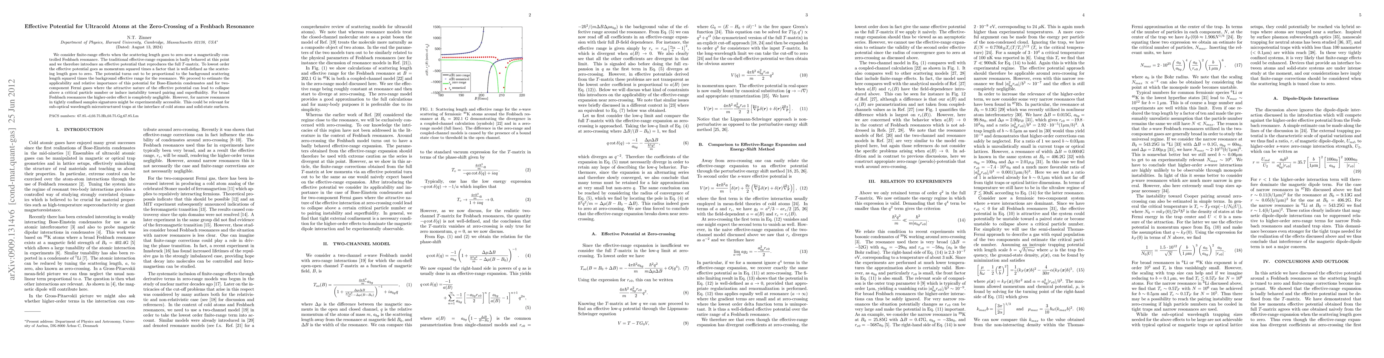 This paper introduces an effective potential to describe ultracold atoms near a Feshbach resonance where the scattering length approaches zero, addressing the limitations of traditional methods. It finds that the effective potential is proportional to the background scattering length squared and effective range, and discusses its implications for Bose-Einstein condensates and Fermi gases, particularly in relation to collapse and superfluidity.