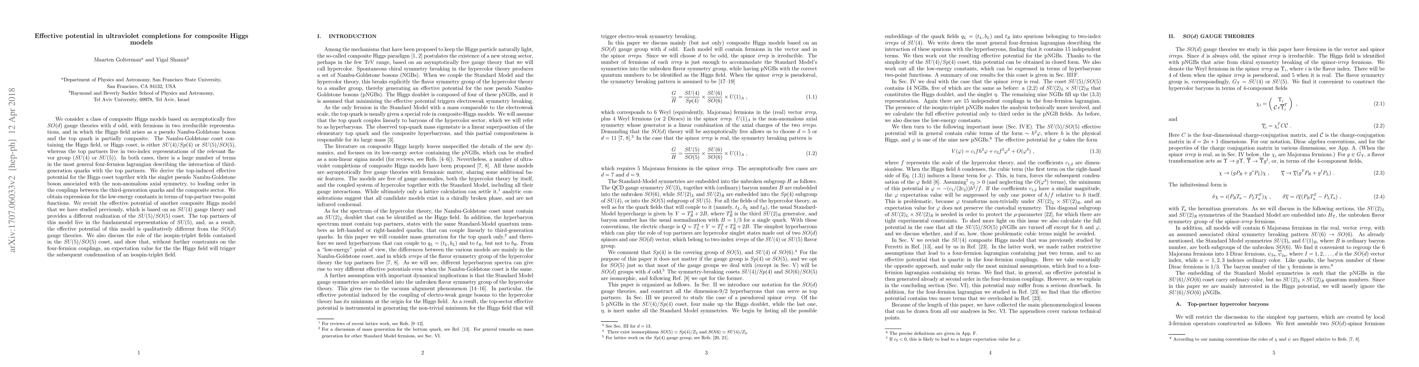 We consider a class of composite Higgs models based on asymptotically free $SO(d)$ gauge theories with $d$ odd, with fermions in two irreducible representations, and in which the Higgs field arises as a pseudo Nambu-Goldstone boson and the top quark is partially composite. The Nambu-Goldstone coset containing the Higgs field, or Higgs coset, is either $SU(4)/Sp(4)$ or $SU(5)/SO(5)$, whereas the top partners live in two-index representations of the relevant flavor group ($SU(4)$ or $SU(5)$). In both cases, there is a large number of terms in the most general four-fermion lagrangian describing the interaction of third-generation quarks with the top partners. We derive the top-induced effective potential for the Higgs coset together with the singlet pseudo Nambu-Goldstone boson associated with the non-anomalous axial symmetry, to leading order in the couplings between the third-generation quarks and the composite sector. We obtain expressions for the low-energy constants in terms of top-partner two-point functions. We revisit the effective potential of another composite Higgs model that we have studied previously, which is based on an $SU(4)$ gauge theory and provides a different realization of the $SU(5)/SO(5)$ coset. The top partners of this model live in the fundamental representation of $SU(5)$, and, as a result, the effective potential of this model is qualitatively different from the $SO(d)$ gauge theories. We also discuss the role of the isospin-triplet fields contained in the $SU(5)/SO(5)$ coset, and show that, without further constraints on the four-fermion couplings, an expectation value for the the Higgs field will trigger the subsequent condensation of an isospin-triplet field.