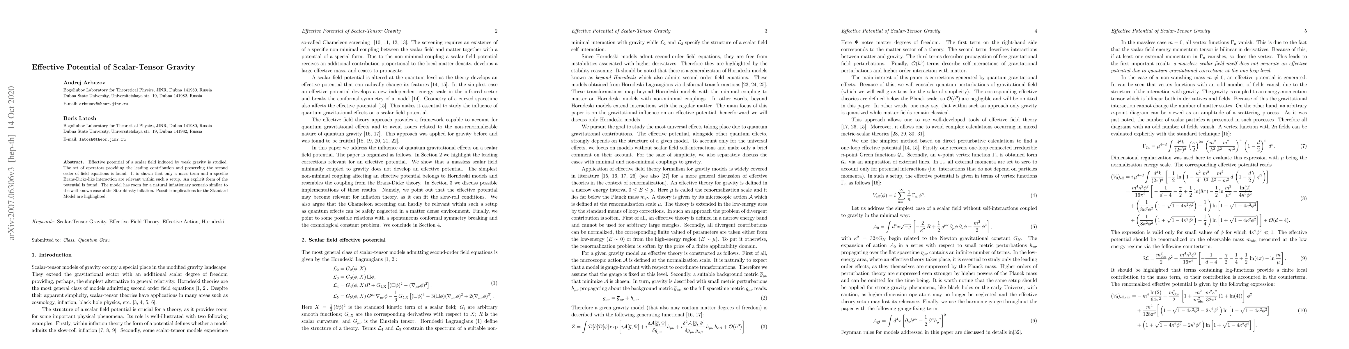 Effective potential of a scalar field induced by weak gravity is studied. The set of operators relevant for leading effects and preserving the second order of field equations is found. It is shown that only the mass term and a specific Brans-Dicke-like interaction are relevant within such a setup. The explicit form of the potential is found. The model has room for a natural inflationary scenario similar to the well-known case of the Starobinsky inflation. Possible implications for the Standard Model are highlighted.