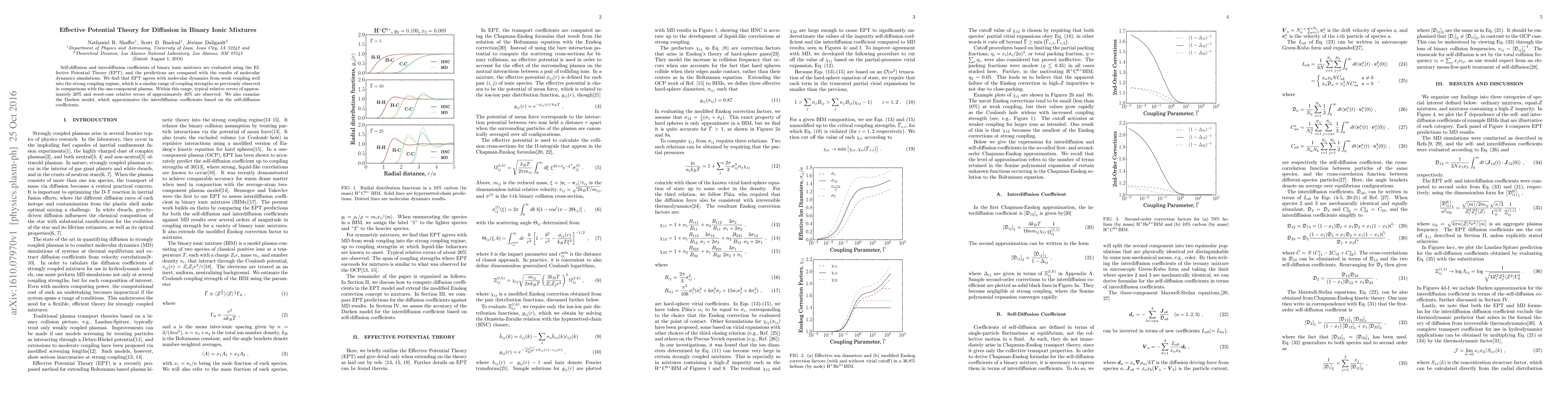 Self-diffusion and interdiffusion coefficients of binary ionic mixtures are evaluated using the Effective Potential Theory (EPT), and the predictions are compared with the results of molecular dynamics simulations. We find that EPT agrees with molecular dynamics from weak coupling well into the strong coupling regime, which is a similar range of coupling strengths as previously observed in comparisons with the one-component plasma. Within this range, typical relative errors of approximately 20% and worst-case relative errors of approximately 40% are observed. We also examine the Darken model, which approximates the interdiffusion coefficients based on the self-diffusion coefficients.