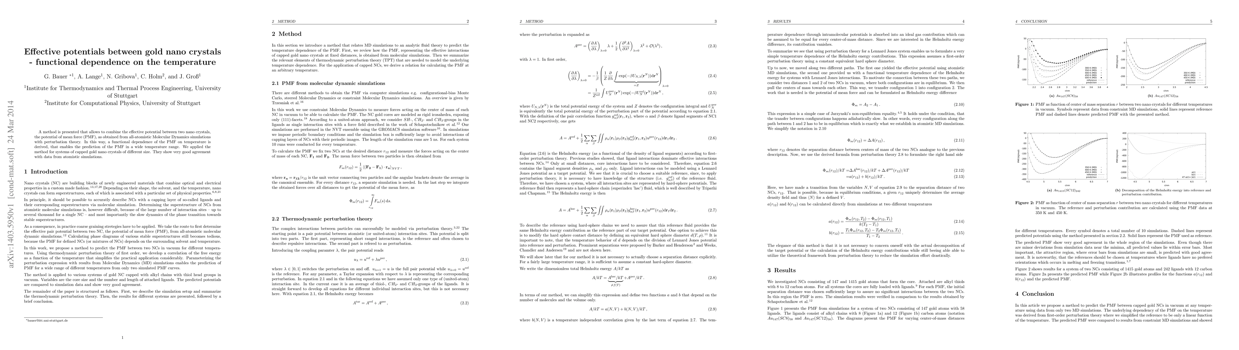 A method is presented that allows to combine the effective potential between two nano crystals, the potential of mean force (PMF), as obtained from all-atomistic Molecular Dynamics simulations with perturbation theory. In this way, a functional dependence of the PMF on temperature is derived, that enables the prediction of the PMF in a wide temperature range. We applied the method for systems of capped gold nano crystals of different size. They show very good agreement with data from atomistic simulations.