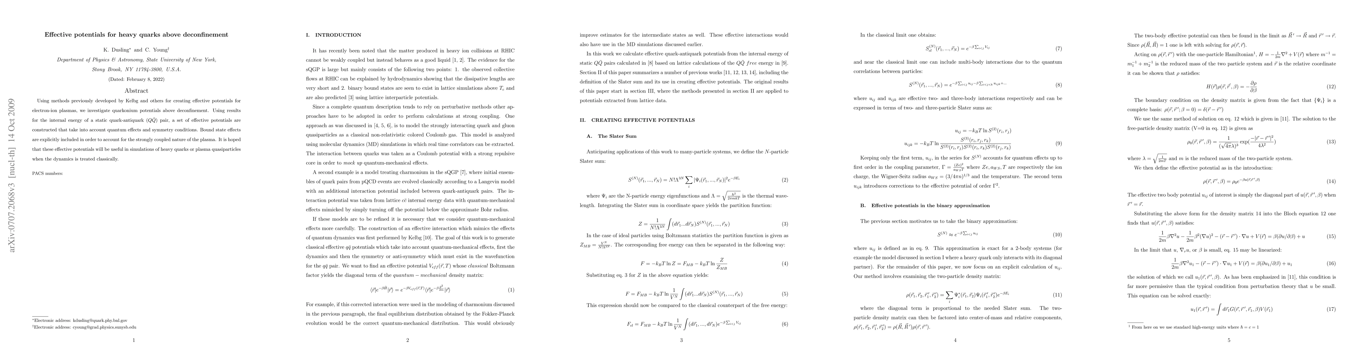 Using methods previously developed by Kelbg and others for creating effective potentials for electron-ion plasmas, we investigate quarkonium potentials above deconfinement. Using results for the internal energy of a static quark-antiquark pair, a set of effective potentials are constructed that take into account quantum effects and symmetry conditions. Bound state effects are explicitly included in order to account for the strongly coupled nature of plasmas. It is hoped that these effective potentials will be useful in simulations of heavy quarks or plasma quasiparticles when the dynamics is treated classically.