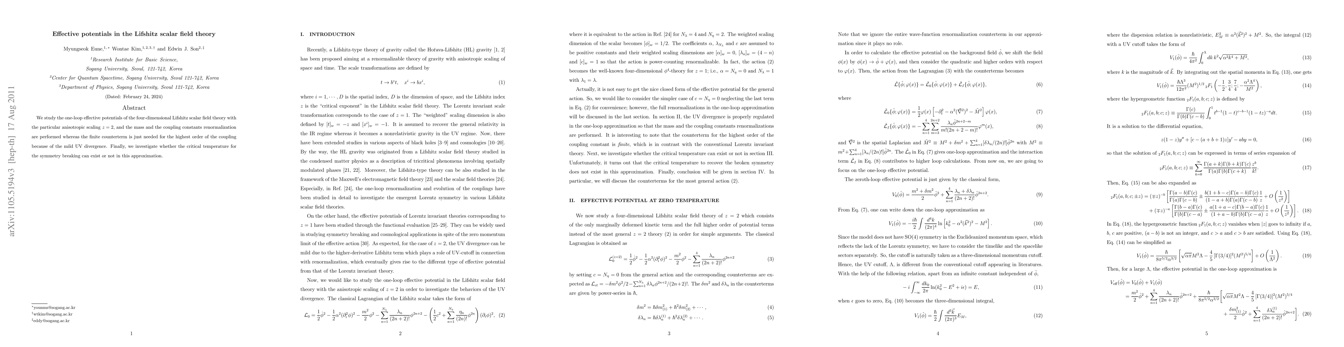 This paper examines the one-loop effective potentials for a four-dimensional Lifshitz scalar field theory with anisotropic scaling $z=2$, demonstrating that renormalization is feasible without altering the coupling constant due to improved UV divergence handling. It also resolves IR divergence in the massless case and provides a condition for symmetry breaking in the massive case, while discussing the potential existence of a critical temperature.