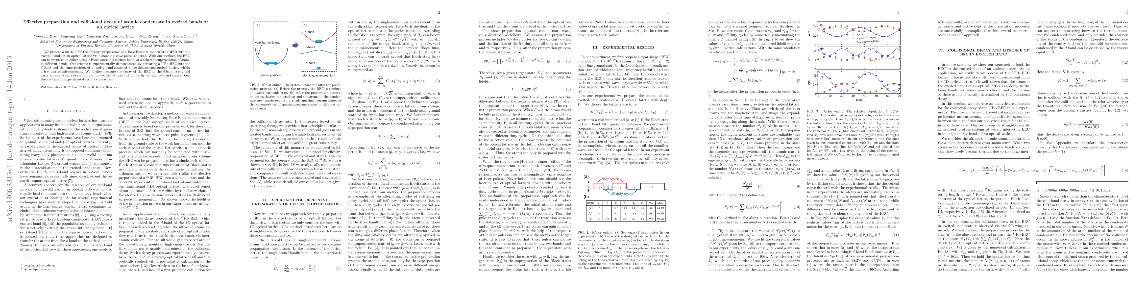 This paper details a method for preparing a Bose-Einstein condensate (BEC) in excited bands of an optical lattice using a standing-wave pulse sequence, demonstrating preparation in single Bloch states or superpositions, and measuring the collisional decay of the BEC in the $d$-band state, with theoretical and experimental results aligning well.