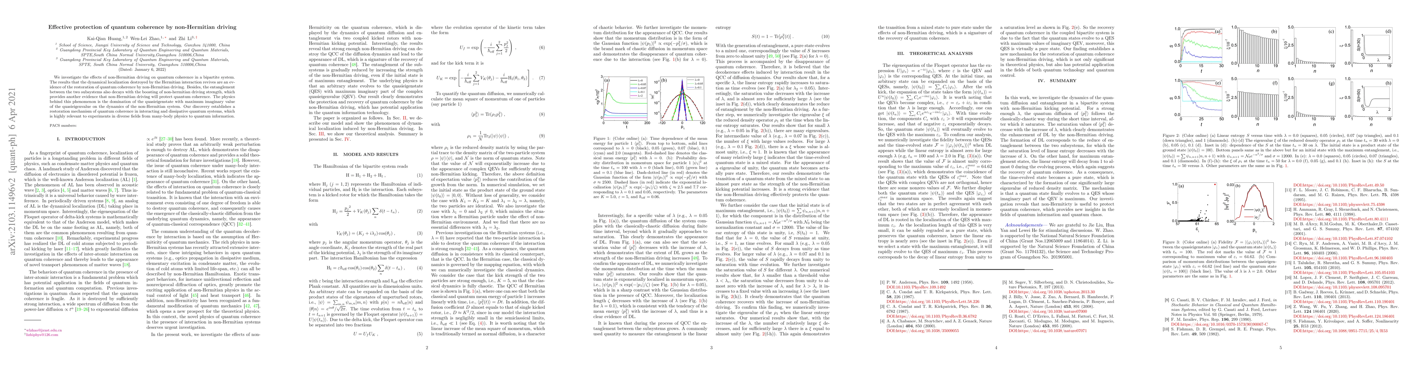This paper explores how non-Hermitian driving can restore quantum coherence in a bipartite system, demonstrating that dynamical localization destroyed by Hermitian interaction can be revived. The study also finds that the entanglement decays with increased non-Hermitian driving strength, further indicating the protection of quantum coherence, underpinned by the dynamics dominated by quasieigenstates with maximum imaginary quasieigenvalues.
