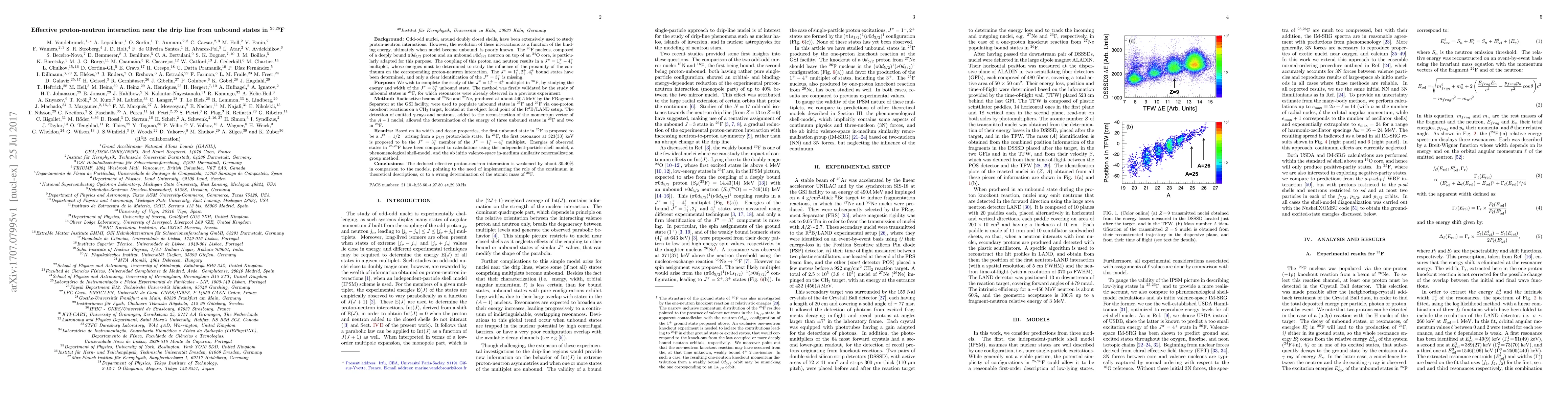 Background: Odd-odd nuclei, around doubly closed shells, have been extensively used to study proton-neutron interactions. However, the evolution of these interactions as a function of the binding energy, ultimately when nuclei become unbound, is poorly known. The $^{26}$F nucleus, composed of a deeply bound $\pi0d\_{5/2}$ proton and an unbound $\nu0d\_{3/2}$ neutron on top of an $^{24}$O core, is particularly adapted for this purpose. The coupling of this proton and neutron results in a $J^{\pi} = 1^{+}\_1 - 4^{+}\_1$ multiplet, whose energies must be determined to study the influence of the proximity of the continuum on the corresponding proton-neutron interaction. The $J^{\pi} = 1^{+}\_1, 2^{+}\_1,4^{+}\_1$ bound states have been determined, and only a clear identification of the $J^{\pi} =3^{+}\_1$ is missing.Purpose: We wish to complete the study of the $J^{\pi} = 1^{+}\_1 - 4^{+}\_1$ multiplet in $^{26}$F, by studying the energy and width of the $J^{\pi} =3^{+}\_1$ unbound state. The method was firstly validated by the study of unbound states in $^{25}$F, for which resonances were already observed in a previous experiment.Method: Radioactive beams of $^{26}$Ne and $^{27}$Ne, produced at about $440A$\,MeV by the FRagment Separator at the GSI facility, were used to populate unbound states in $^{25}$F and $^{26}$F via one-proton knockout reactions on a CH$\_2$ target, located at the object focal point of the R$^3$B/LAND setup. The detection of emitted $\gamma$-rays and neutrons, added to the reconstruction of the momentum vector of the $A-1$ nuclei, allowed the determination of the energy of three unbound states in $^{25}$F and two in $^{26}$F. Results: Based on its width and decay properties, the first unbound state in $^{25}$F is proposed to be a $J^{\pi} = 1/2^-$ arising from a $p\_{1/2}$ proton-hole state. In $^{26}$F, the first resonance at 323(33)~keV is proposed to be the $J^{\pi} =3^{+}\_1$ member of the $J^{\pi} = 1^{+}\_1 - 4^{+}\_1$ multiplet. Energies of observed states in $^{25,26}$F have been compared to calculations using the independent-particle shell model, a phenomenological shell-model, and the ab initio valence-space in-medium similarity renormalization group method.Conclusions: The deduced effective proton-neutron interaction is weakened by about 30-40\% in comparison to the models, pointing to the need of implementing the role of the continuum in theoretical descriptions, or to a wrong determination of the atomic mass of $^{26}$F.