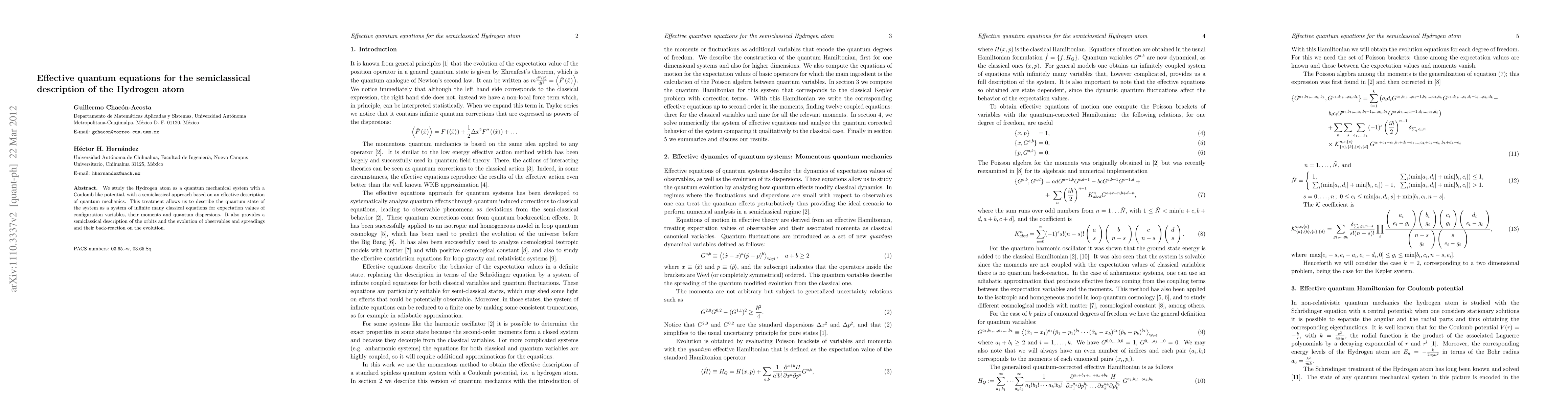 This paper proposes an effective quantum equation for a semiclassical description of the Hydrogen atom, utilizing a classical approach to model quantum states through infinite classical equations for expectation values and moments, providing insights into orbits, observable evolution, and back-reaction.