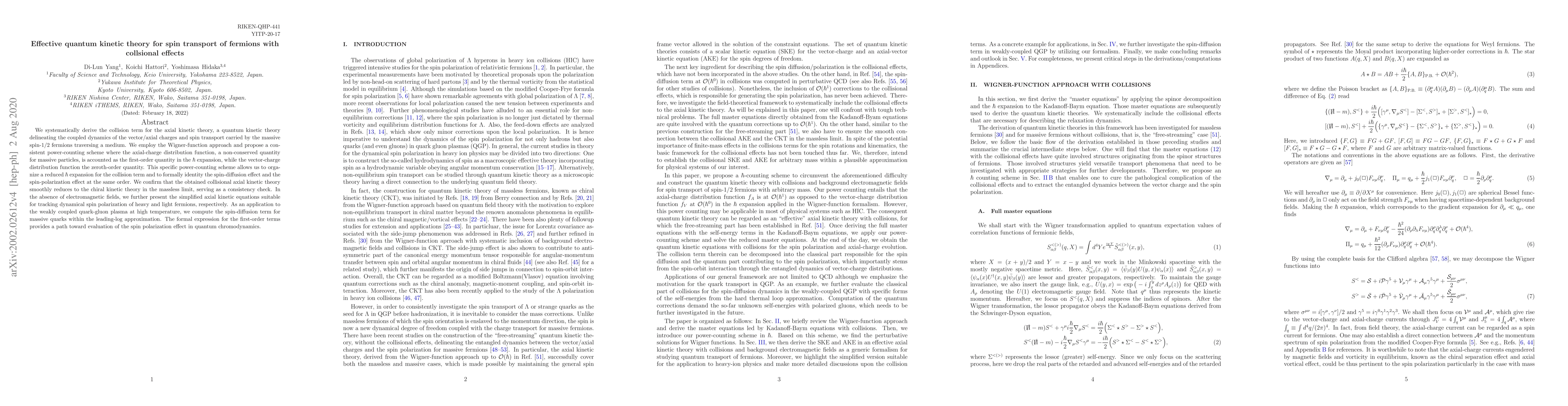 This paper develops a quantum kinetic theory for spin transport in fermions, deriving a collision term for axial kinetic theory that accounts for spin-diffusion and spin-polarization effects. The study employs a Wigner-function approach and a specific power-counting scheme to organize the $\hbar$ expansion, confirming consistency with chiral kinetic theory in the massless limit.