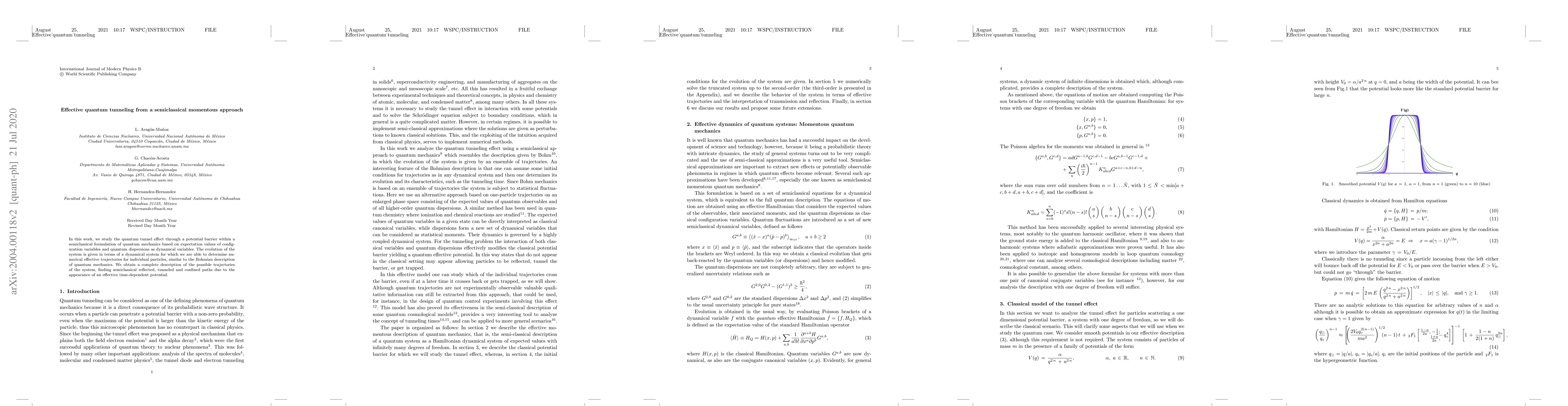 We study the quantum tunnel effect through a potential barrier employing a semiclassical formulation of quantum mechanics based on expectation values of configuration variables and quantum dispersions as dynamical variables. The evolution of the system is given in terms of a dynamical system for which we are able to determine effective trajectories for individual particles, in a total resemblance of the Bohmian description of quantum mechanics. We obtain a type of semiclassical confinement for particles in a similar way as with the quantum potential, and also determine a semiclassical transmission coefficient for the tunneling process.