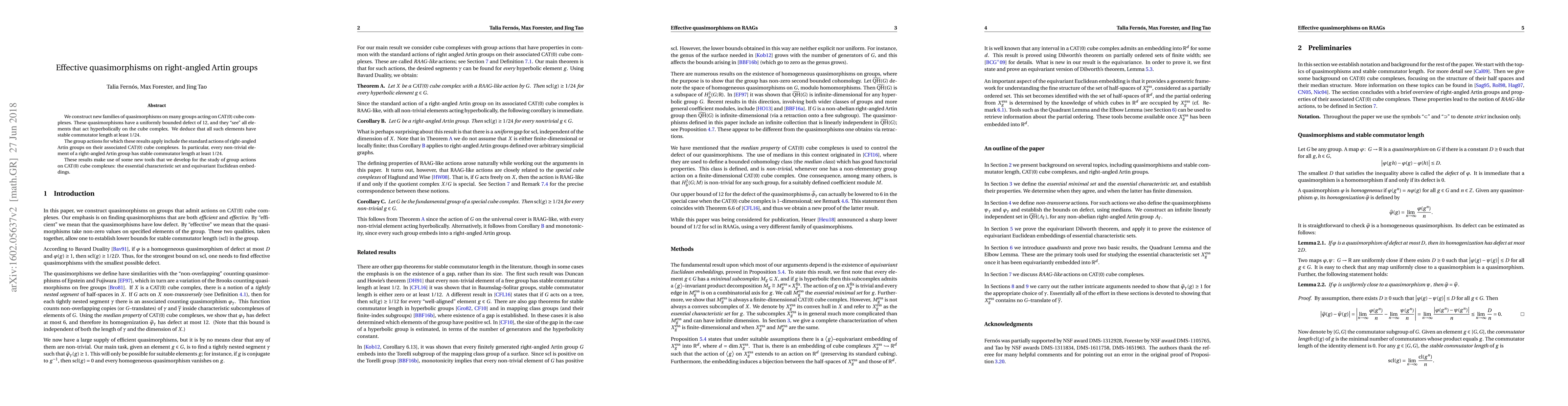 This paper constructs new quasimorphisms for right-angled Artin groups acting on CAT(0) cube complexes, showing a bounded defect and revealing hyperbolic elements' stable commutator length, proving every non-trivial element has a stable commutator length of at least 1/24. It introduces new tools like essential characteristic sets and equivariant Euclidean embeddings.