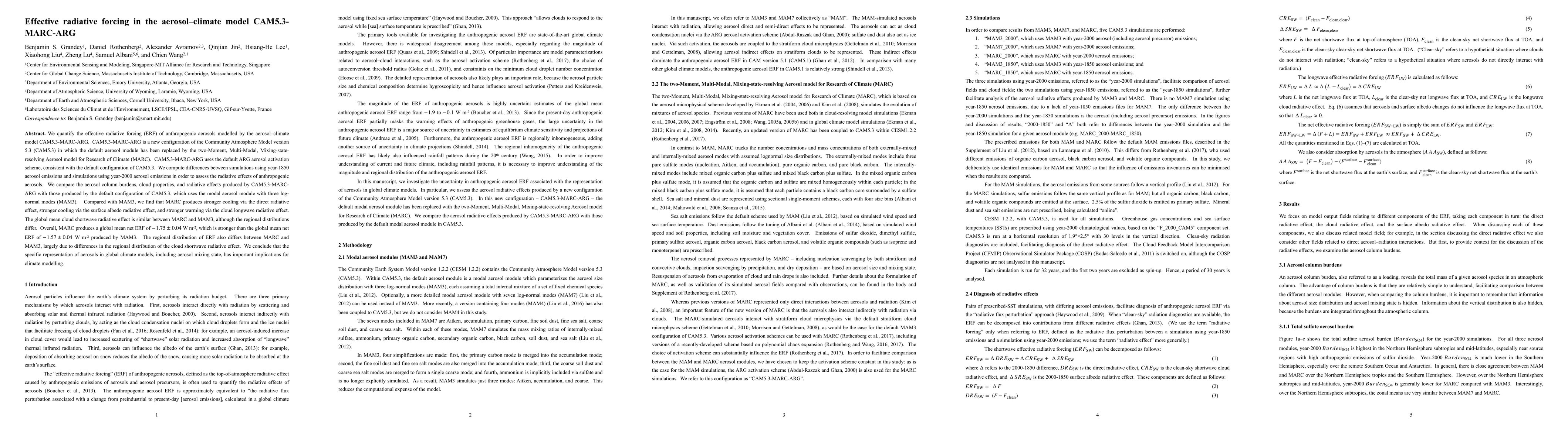 This paper quantifies the effective radiative forcing (ERF) of anthropogenic aerosols in the CAM5.3-MARC-ARG model, which replaces CAM5.3's default aerosol module with a more advanced aerosol model. MARC produces stronger cooling and warming effects compared to the default model, resulting in a stronger global mean net ERF of -1.75 W m$^{-2}$, highlighting the importance of aerosol representation in climate models.