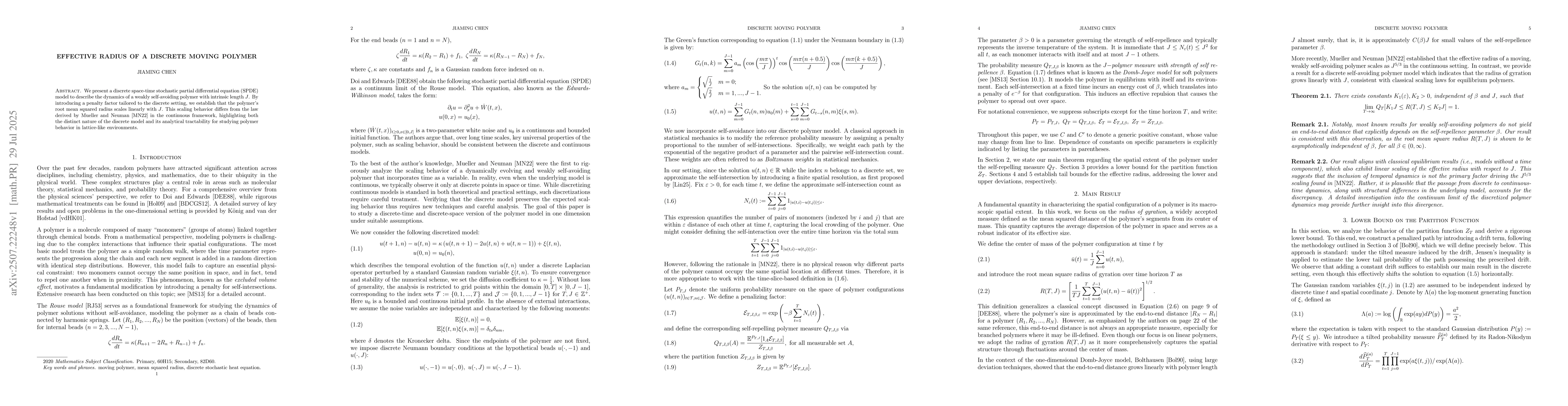 We present a discrete space-time stochastic partial differential equation (SPDE) model to describe the dynamics of a weakly self-avoiding polymer with intrinsic length $J$. By introducing a penalty factor tailored to the discrete setting, we establish that the polymer's root mean squared radius scales linearly with $J$. This scaling behavior differs from the law derived by Mueller and Neuman \cite{mueller2022scaling} in the continuous framework, highlighting both the distinct nature of the discrete model and its analytical tractability for studying polymer behavior in lattice-like environments.