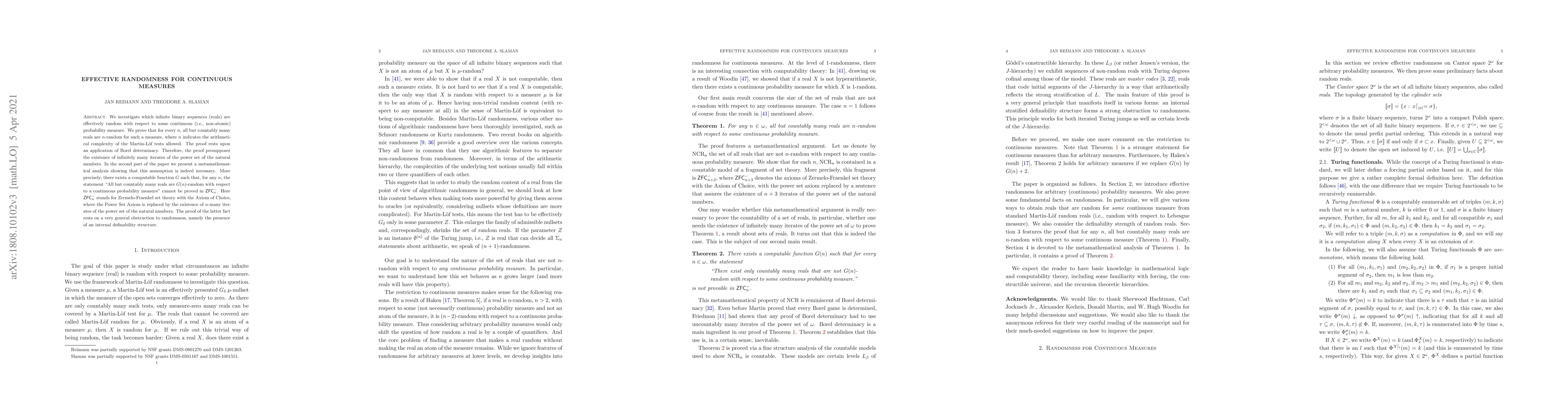We investigate which infinite binary sequences (reals) are effectively random with respect to some continuous (i.e., non-atomic) probability measure. We prove that for every n, all but countably many reals are n-random for such a measure, where n indicates the arithmetical complexity of the Martin-L\"of tests allowed. The proof is based on a Borel determinacy argument and presupposes the existence of infinitely many iterates of the power set of the natural numbers. In the second part of the paper we present a metamathematical analysis showing that this assumption is indeed necessary. More precisely, there exists a computable function G such that, for any n, the statement `All but countably many reals are G(n)-random with respect to a continuous probability measure' cannot be proved in $ZFC^-_n$. Here $ZFC^-_n$ stands for Zermelo-Fraenkel set theory with the Axiom of Choice, where the Power Set Axiom is replaced by the existence of n-many iterates of the power set of the natural numbers. The proof of the latter fact rests on a very general obstruction to randomness, namely the presence of an internal definability structure.